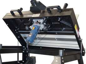 The RT-100 utilises a sliding table that makes material processing much easier and safer, particularly when making raised panels or shaping short sides. The split fence is easy to adjust and provides full support along both sides of the work-piece. Other features include a 60mm dust port with hood, tilt-up table with gas strut supports for easy router access, universal router mount and sturdy stand with a convenient shelf. Last but not least, a conveniently front mounted main switch allows you to turn the router ON/OFF without bending over and reaching under the table. Very convenient!