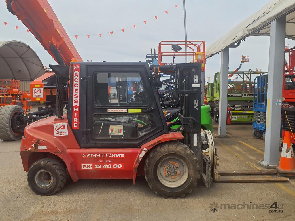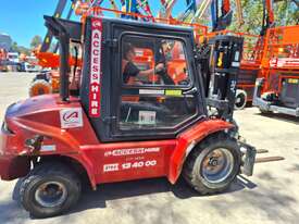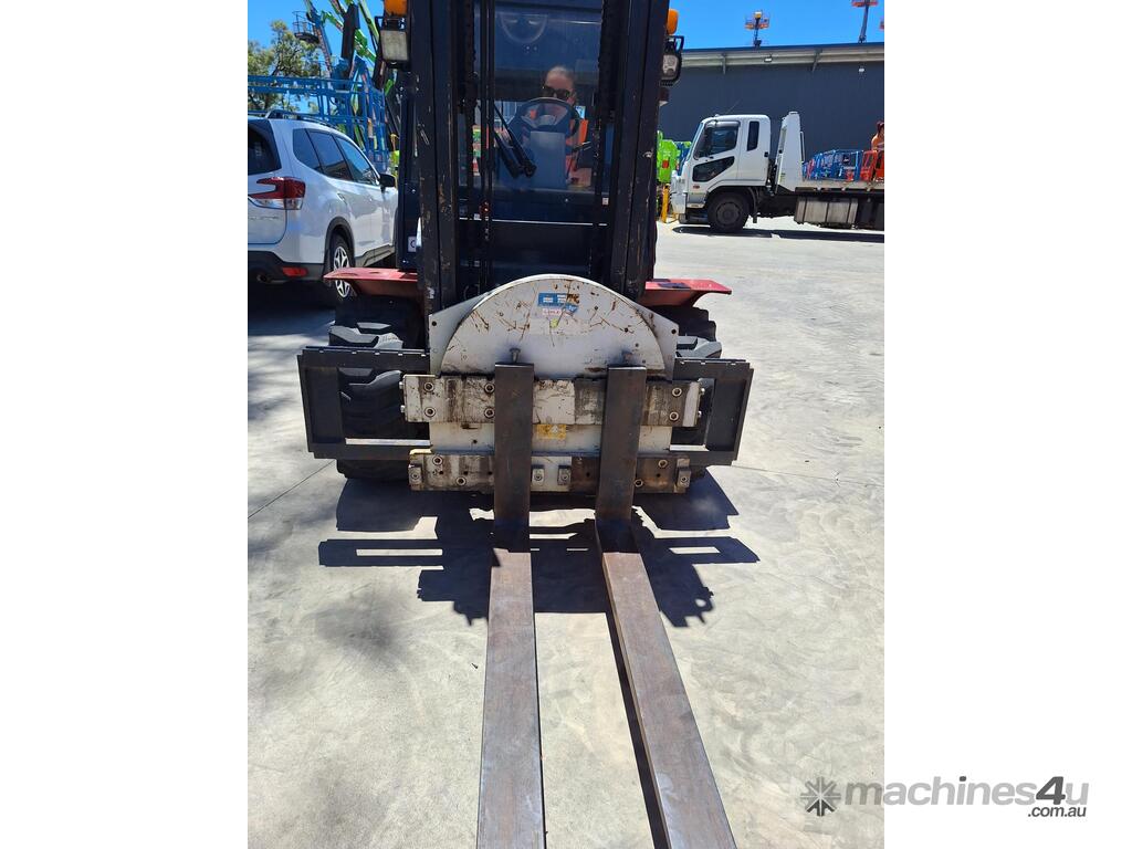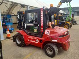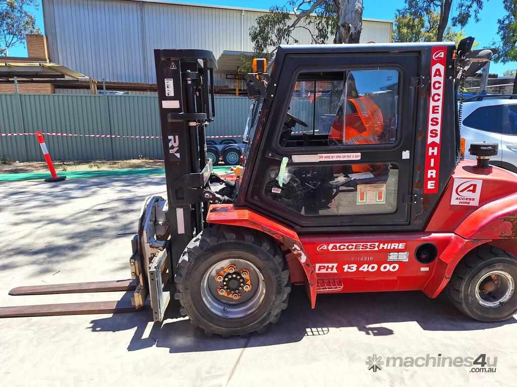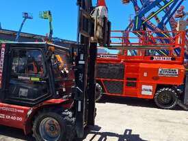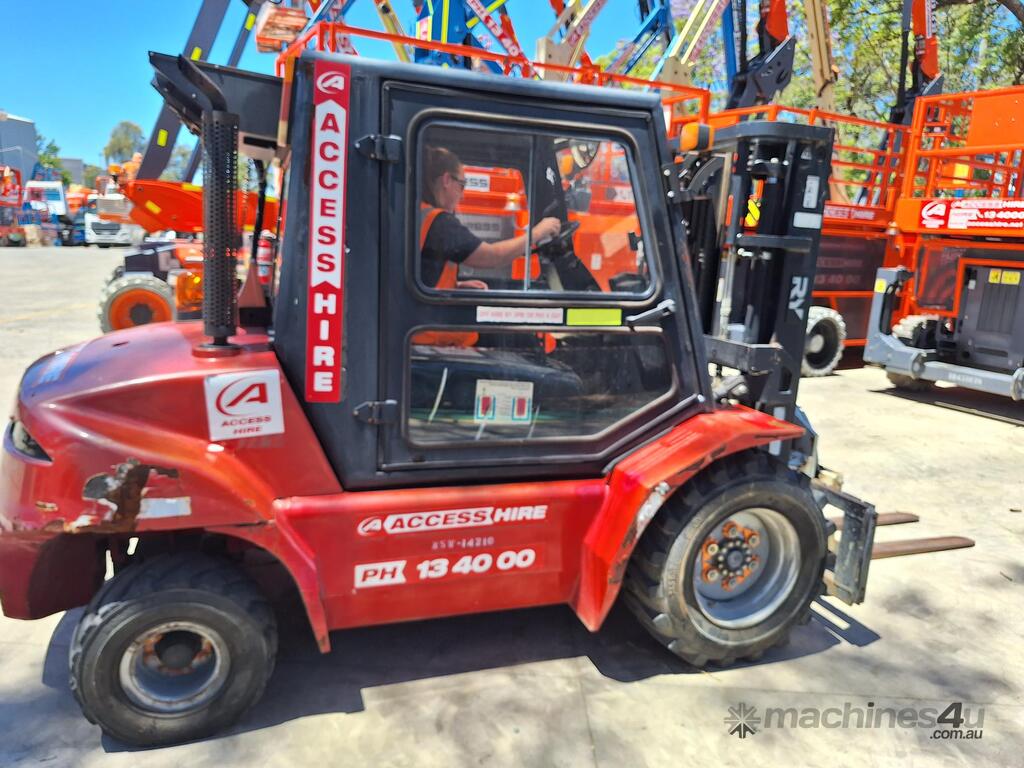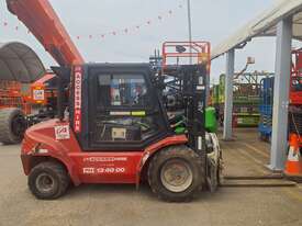 Our 2.5T Rough Terrain Diesel Forklift (model FDT25T-CW3) is a compact yard and site machine built to work on uneven ground where a standard warehouse forklift struggles. It offers a 2,500kg lift capacity at 500mm load centre with a 3.0m lift height and a wide-view mast that keeps the operator’s view clear when handling loads. A Yanmar 4TNE98 diesel engine and two-wheel drive rough terrain axle give strong traction and steady travel on gravel or hardstand while the floating operator station and suspension seat help reduce vibration for the driver.