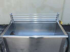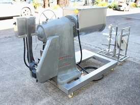 Paddle Mixer, "Manesty", 75 litre capacity, bowl size 680mm x 380mm x 480mm deep, stainless steel wetted parts with 370mm diameter rotor, belt driven by 3 phase 1.5kW 1440rpm motor, provided with timer and control panel, manual tipping bowl system complete with bifold grid, mounted on stainless steel mobile base frame