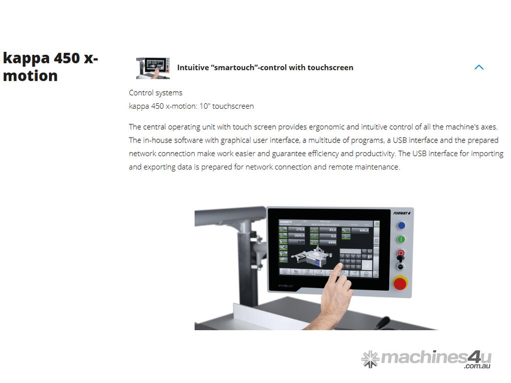 The x-motion features of the Format 4 kappa 450 impress with an automatic rip fence, unlimited tool storage and programmable cutting sequences in the smart, in-house software. All axes of the machine can be controlled ergonomically and intuitively by the central operating unit with 10 "touch screen.