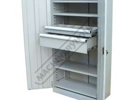 This cupboard comes standard with 4 shelves, 1 x 100mm deep drawer & 1 x 200mm with all being adjustable allowing you the ability to set up the positions of the shelves or the drawers to suit your application, optional extra drawers & shelve packs are available for further customisation.