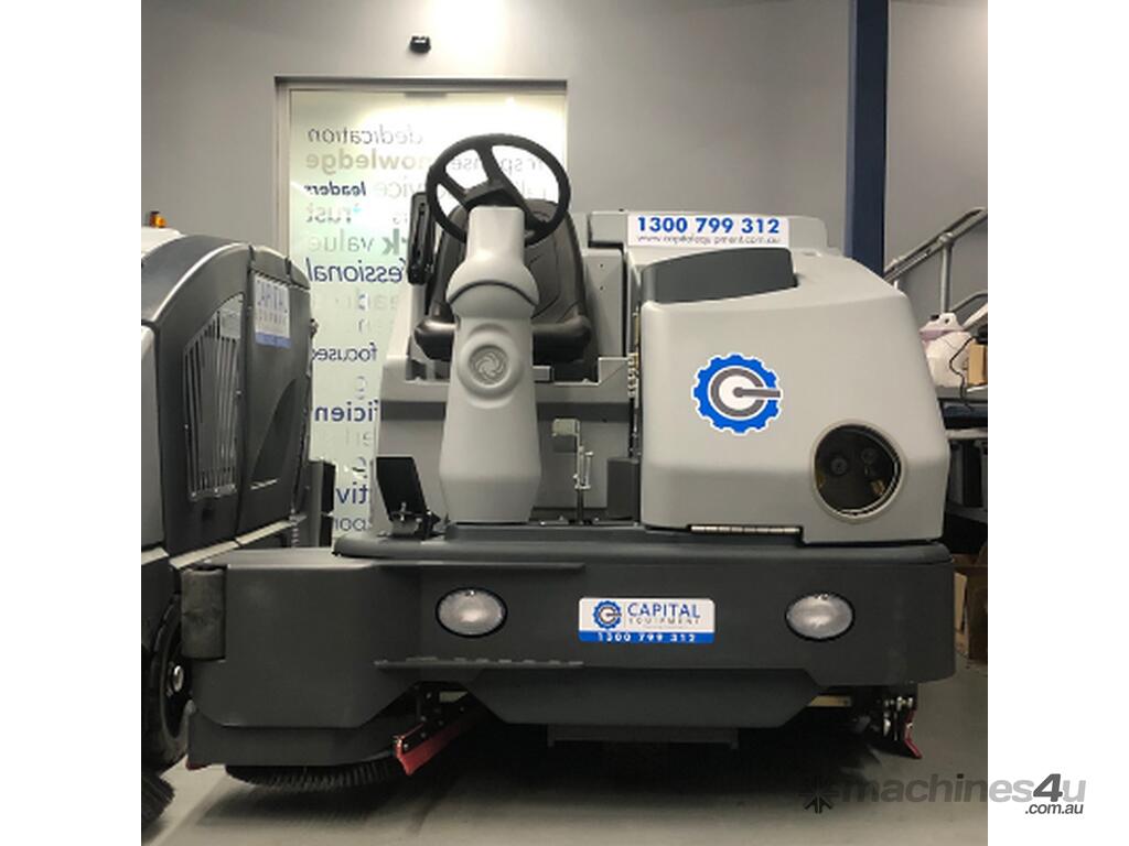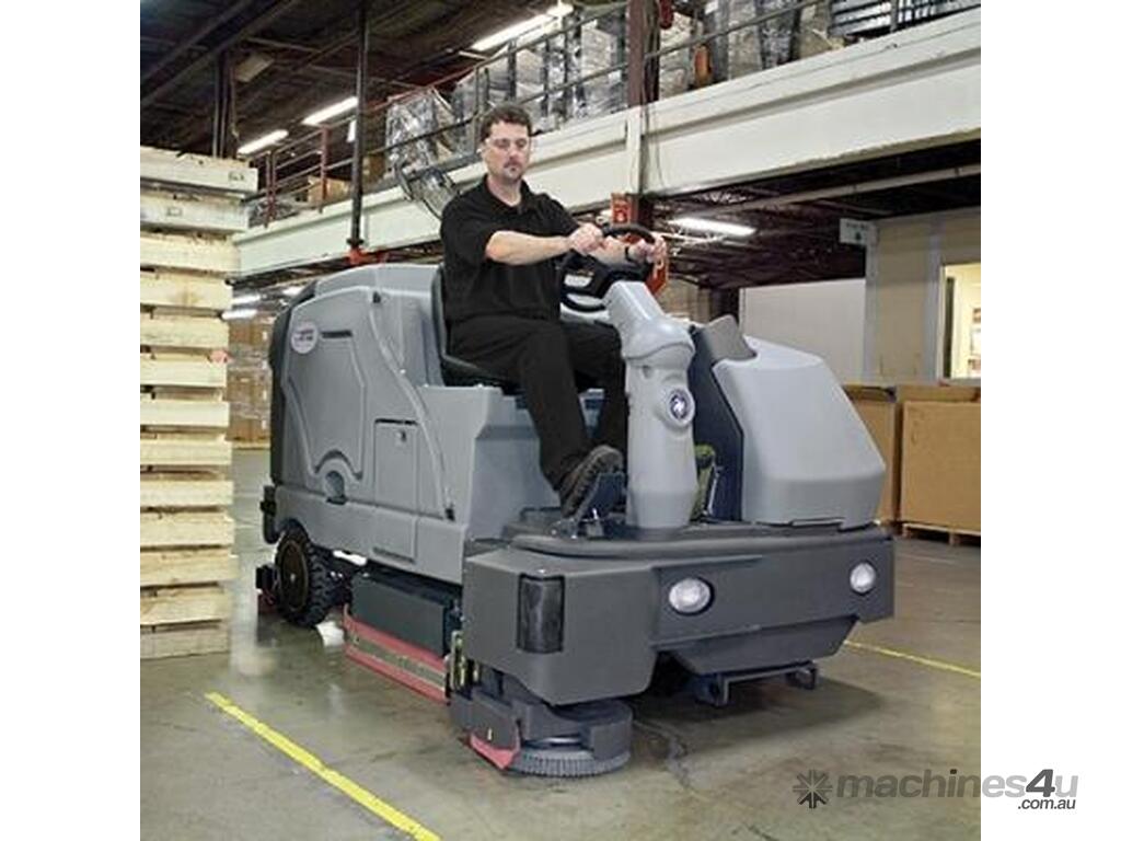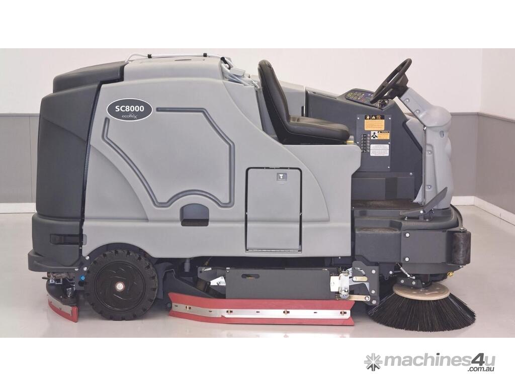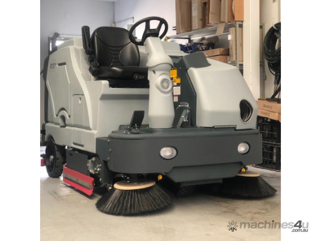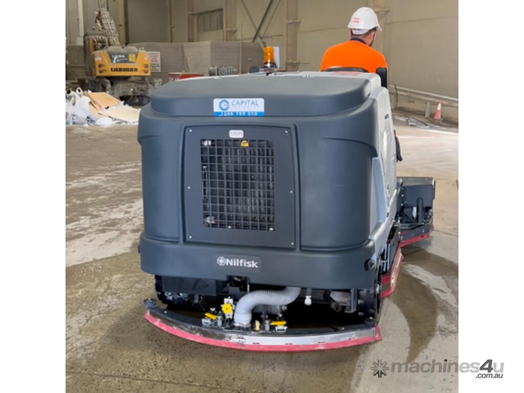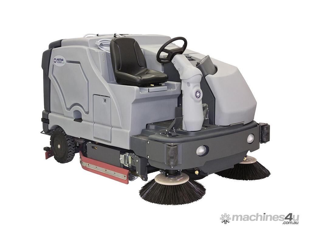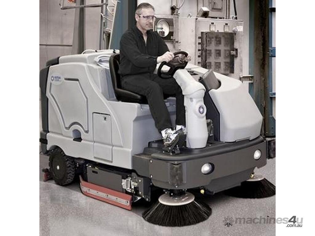 Nilfisk SC8000 Industrial Scrubber Sweeper Dryer complete with Prolene Cylindrical Brushes, Squeegee Kits, Safety Amber Beacon, Reverse Alarm, and dual front sweeping brushes with DustGuard misting system.