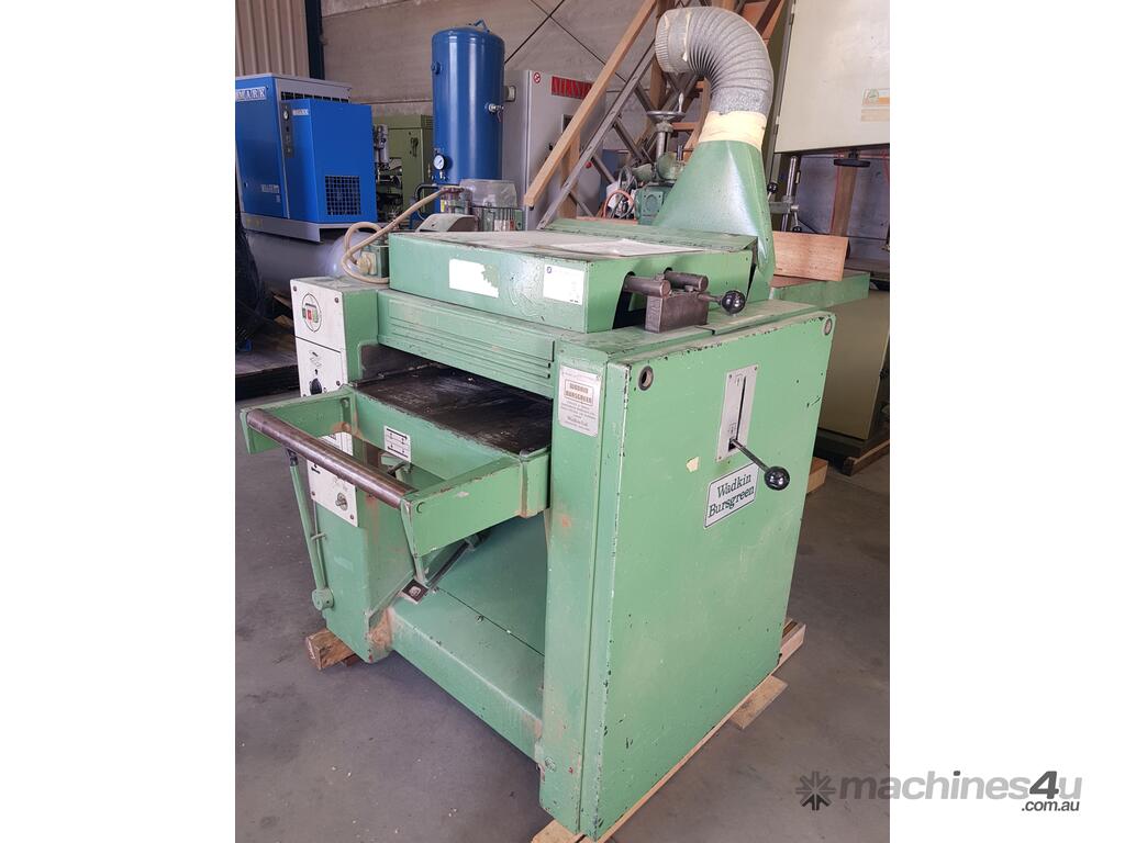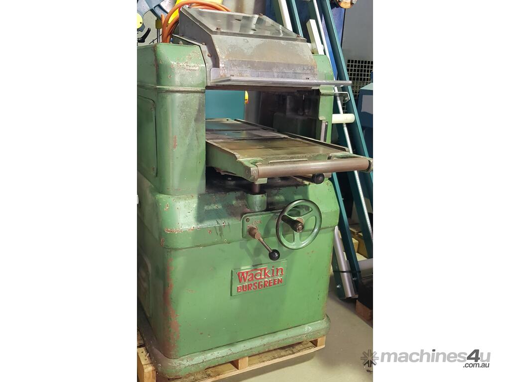 10). WADKIN BURSGREEN BT500 PLANER/THICKNESSER 500mm Width HEAVY DUTY, MADE IN ENGLAND, UNIQUE RISE & FALL FEED TABLE WEDGE DESIGN, INCLUDING BUILT-IN KNIFE GRINDER (JOINTING KNIVES) RESULTING IN FEED SPEED INCREASED TO 30.5 FEET PER MINUTE, VARIABLE FEED SPEED, ELECTRIC RISE & FALL, 2 x GRAVITY TABLE FEED ROLLERS. VERY GOOD ORIGINAL CONDITION. REFER TO ATTACHED BROCHURE. HUGE PRICE REDUCTION!