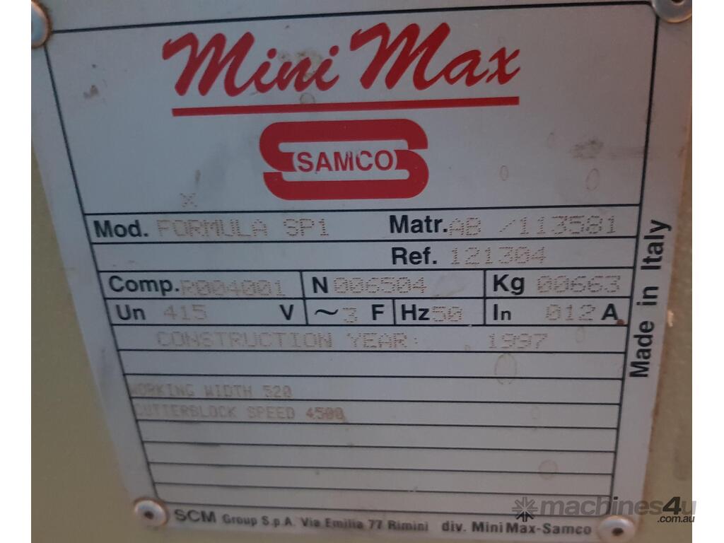 9). MINIMAX FORMULA SP1 520mm Width x 250mm Depth PLANER/THICKNESSER, 7.5hp Main Motor 415v, Year 1997, MADE IN ITALY, 4 x FEED SPEEDS, SERRATED INFEED ROLLER, ELECTRIC RISE & FALL - COUNTER READOUT, AUTO BRAKING, HEAVY DUTY, GOOD ORIGINAL CONDITION. HUGE PRICE REDUCTION!