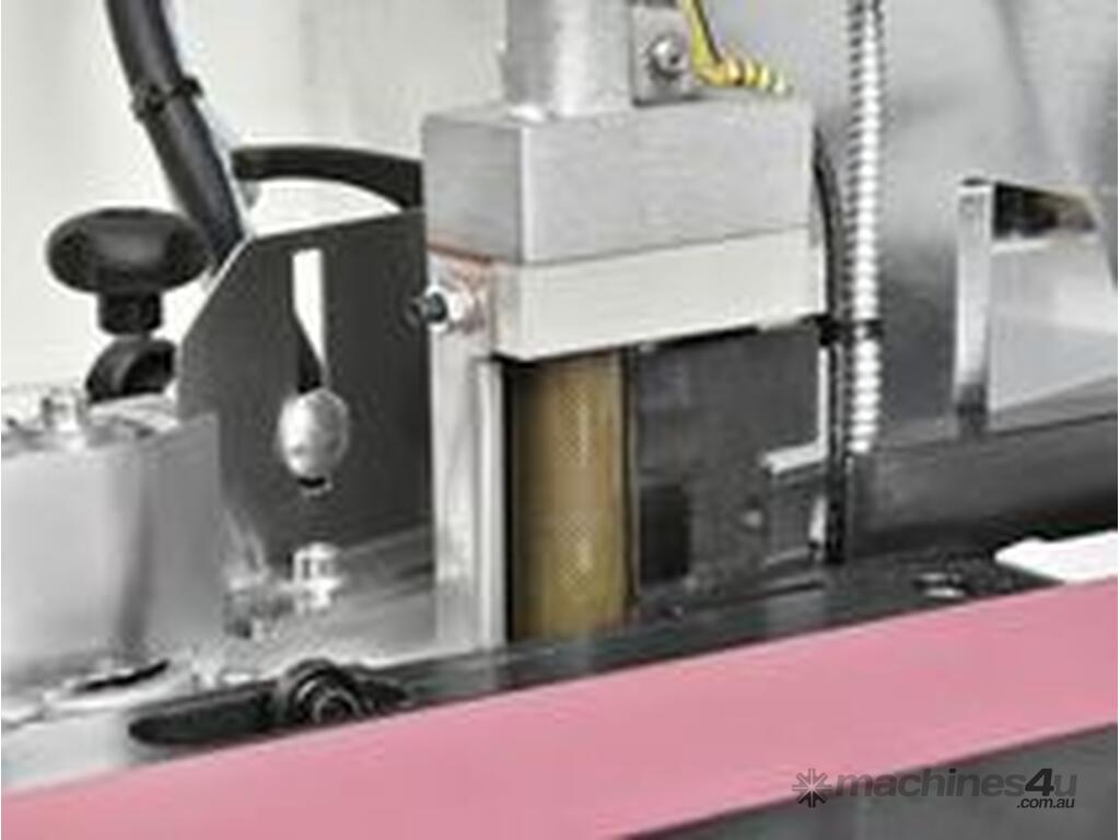 Machine is equipped with end cut off saw, top and bottom trimmers, and can have Radius Scrapers, Glue Scrapers and Buffers.