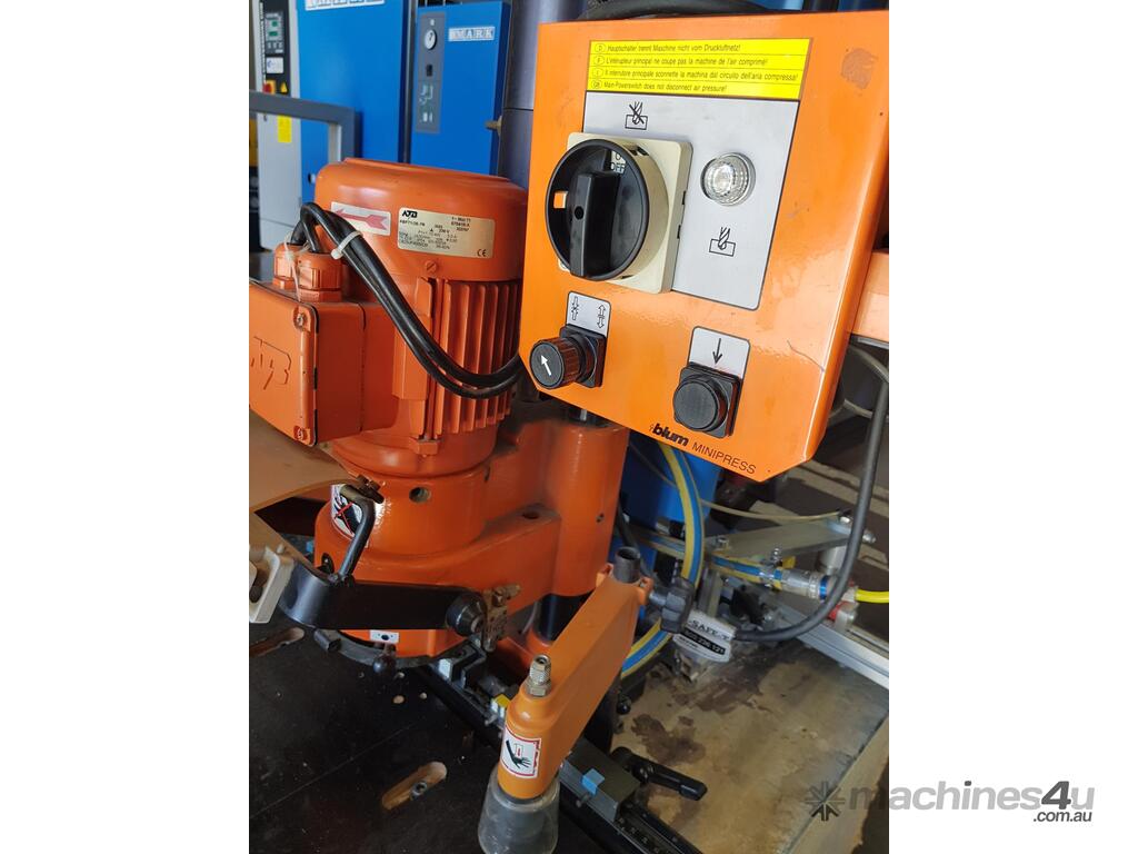7. BLUM MINIPRESS Model P PACKAGE HINGE BORER/INSERTER 240v MADE IN GERMANY MOUNTED ON MOBILE BENCH INCLUDING COLOUR-CODED FLIPOVER FENCE STOPS & EXTENSION FENCES, ALL FACTORY ACCESSORIES, LOCKING CASTOR WHEELS, OPERATOR MANUALS, IN VIRTUALLY NEW CONDITION. HUGE PRICE REDUCTION!