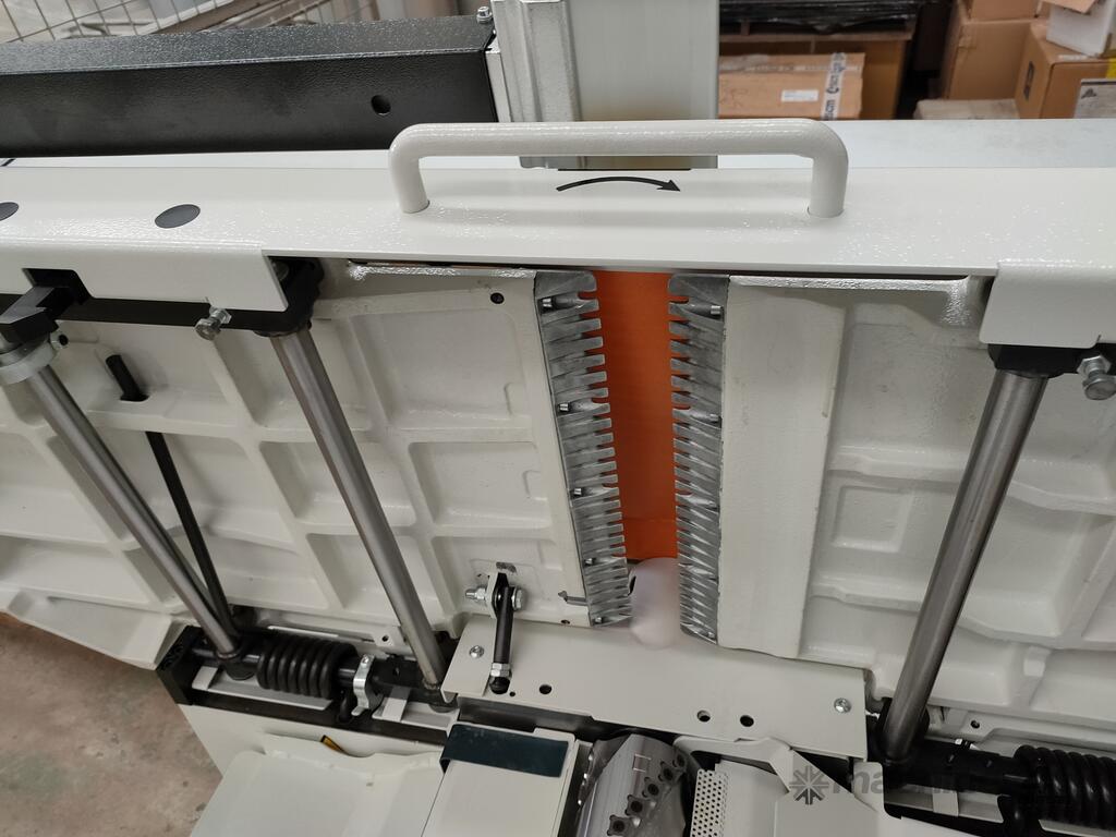Optimal planing with the 120 mm diameter cutter block and 4 knives. For an impeccable finish the pressure of the thicknesser feed rollers can be adjusted according to the type of wood machined. The roller infeed has a helicoidal profile to guarantee firm and constant work piece feed, while the outfeed roller in sandblasted steel maintains the perfect post-processing finishing.