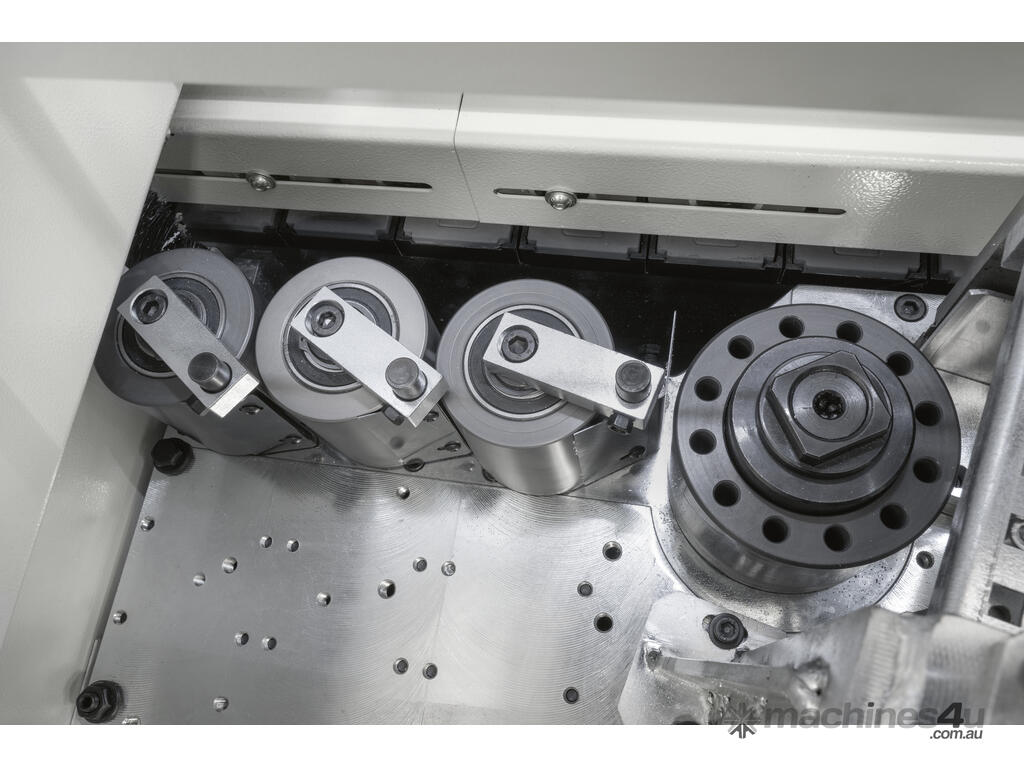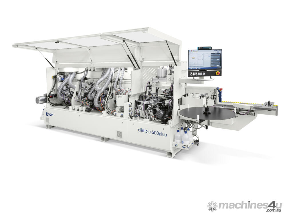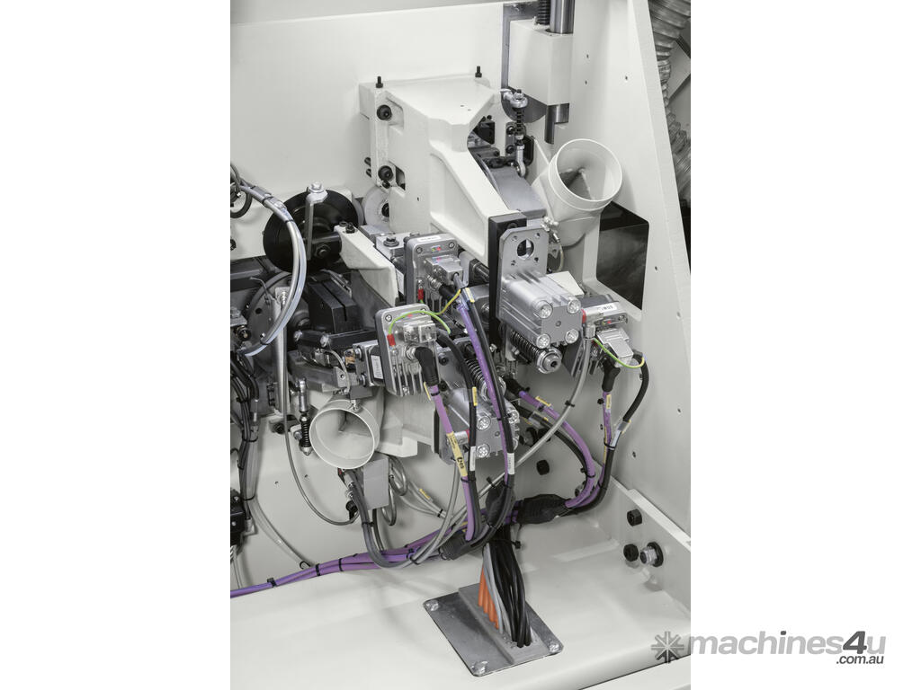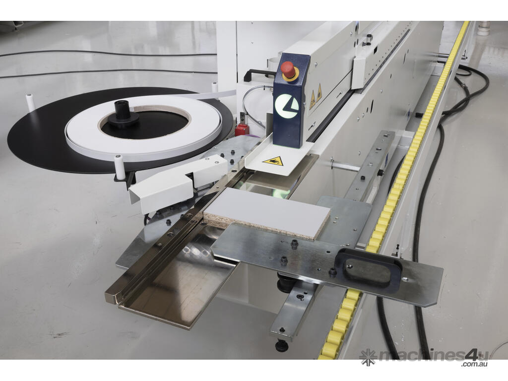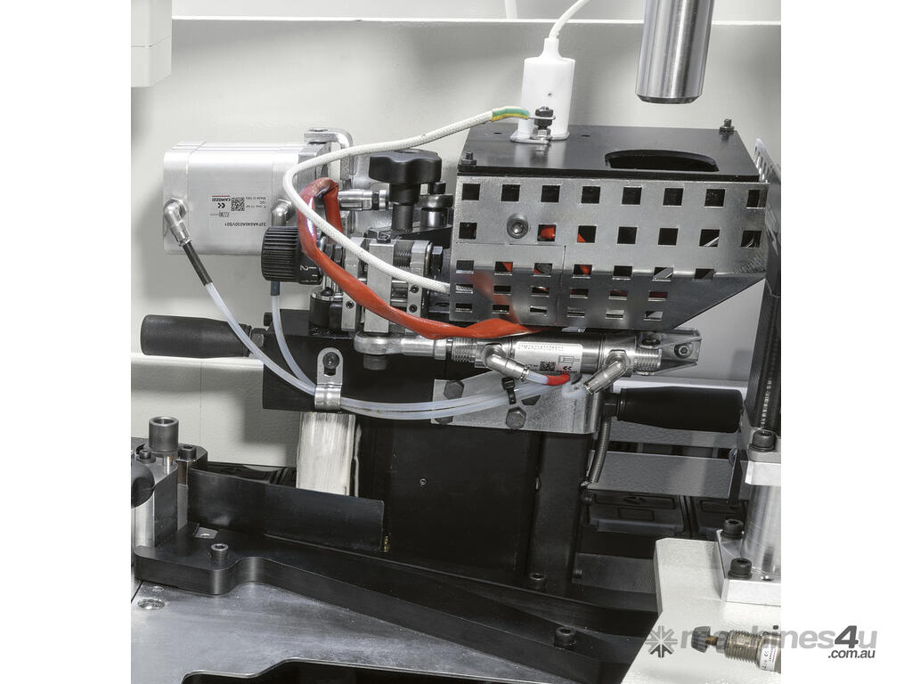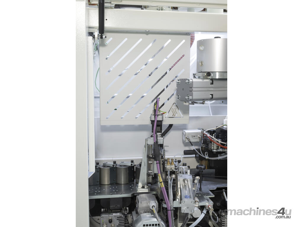 NC axes for fast and error-free machining changes including upper pressure beam, glue dosage, end-trimming unit, rounding unit, edge-scraping unit.