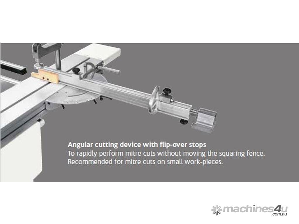 Unique in the world in its category, with a cutting height of 118 mm. The cast iron saw unit with a rigid closed loop structure can accommodate a blade of 315 and 350 mm diameter with the scoring blade mounted, ensuring perfect and easy cutting of veneer panels and thick solid wood material. The saw blade uses 100% of the motor power, thanks to the scoring blade with an independent motor as standard. The rotation fulcrums of the saw unit have a 120 mm diameter and stand on steady crescent shaped rests that separate it from the base: a rigid reliable solution.