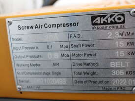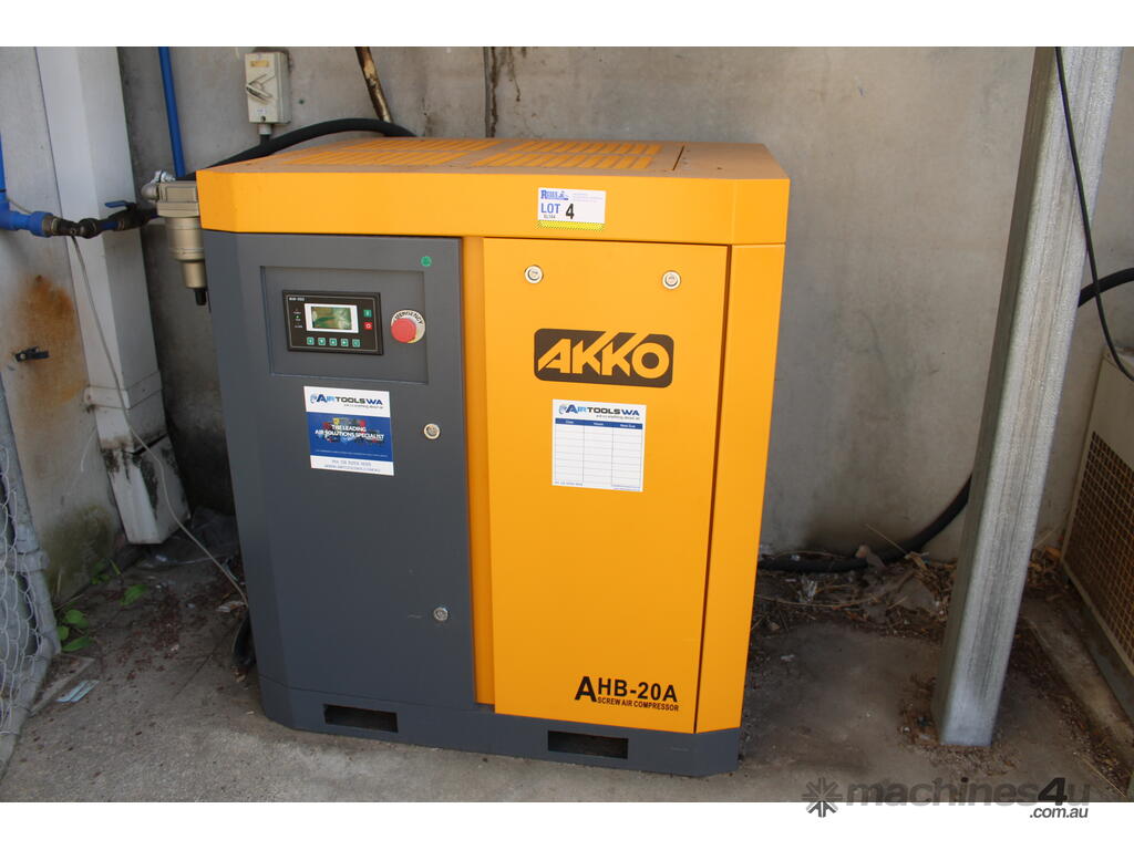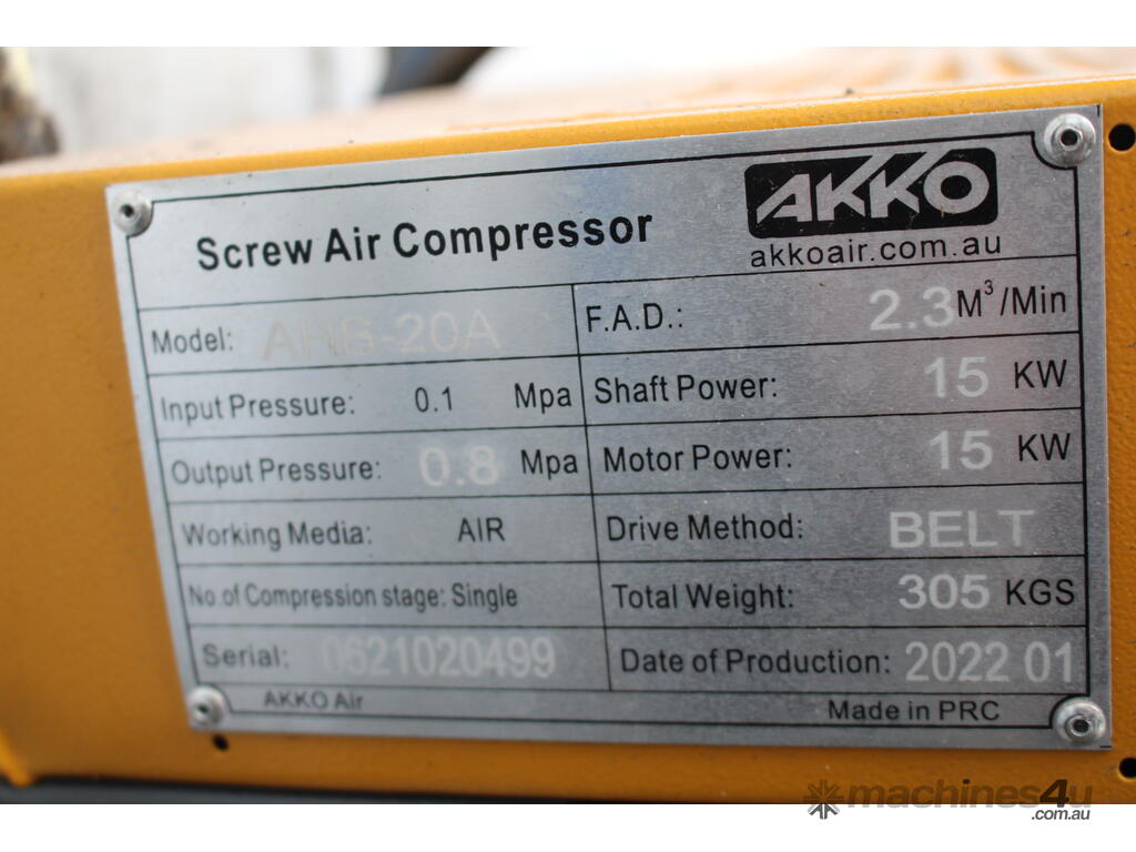 SCREW AIR COMPRESSOR; MAKE: AKKO AIR; MODEL: AHB-20A; SERIAL: ; DOM: 2022; TOTAL HOURS: 10; ELECTRIC, 3 PHASE, HARD-WIRED.