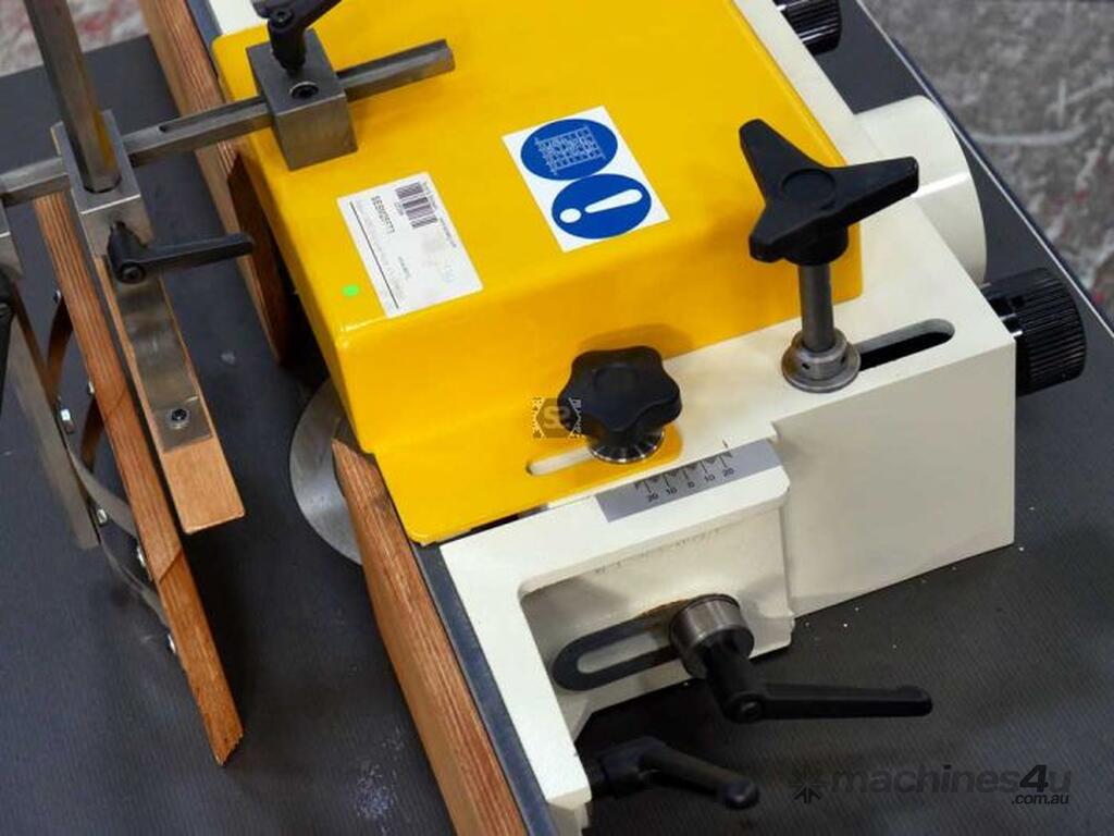 To provide a stable moving platform for tenoning etc. The table is manufactured in steel tube, and runs on precision-ground case-hardened rollers and bearings. A mitre fence with 90-45o adjustment, timber stop and cam action timber clamp are all incorporated.