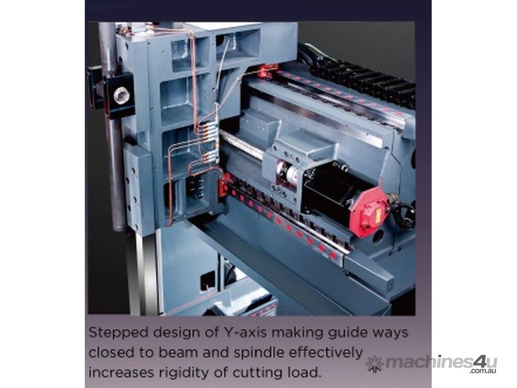 - Twin Hydraulic cylinders plus pressured nitrogen accumulator balancing design provides smooth & accurate feeding performance. Z-axis can reach 0.5G acceleration and keep a holding position at power failure.