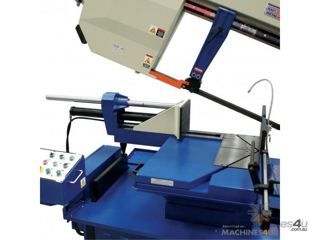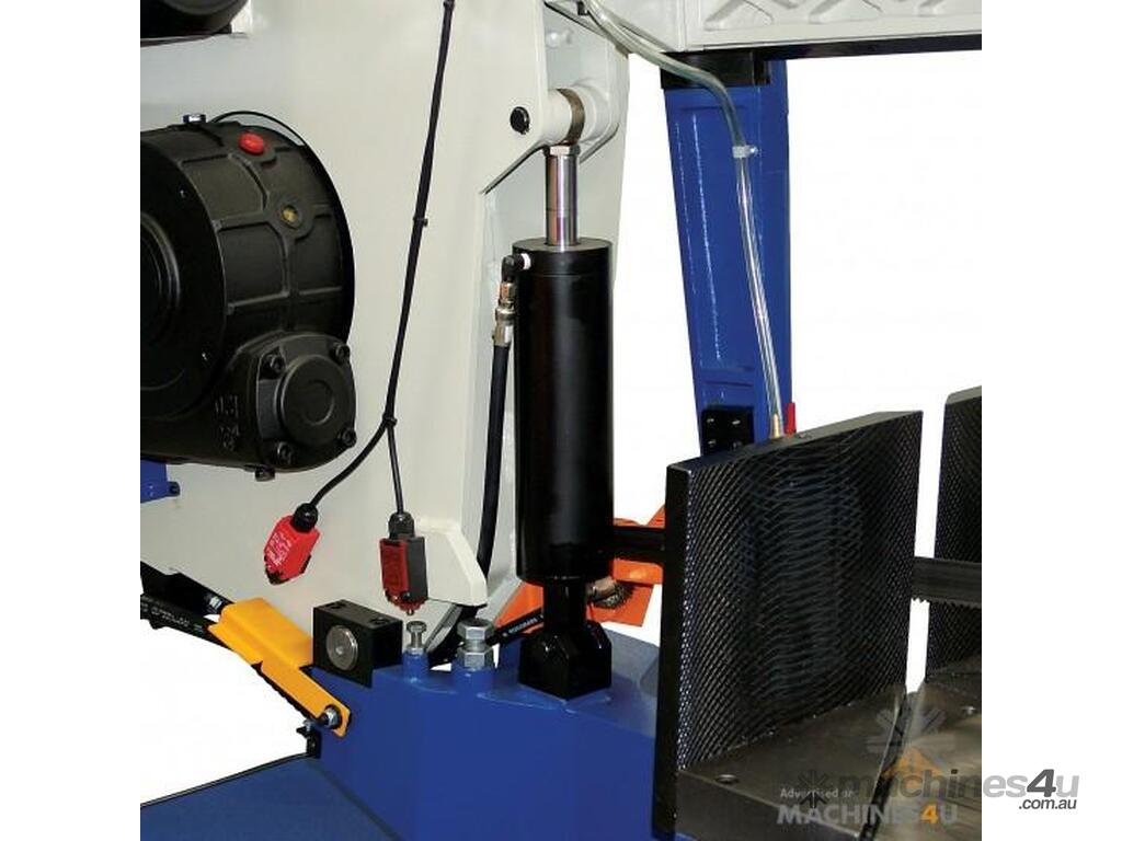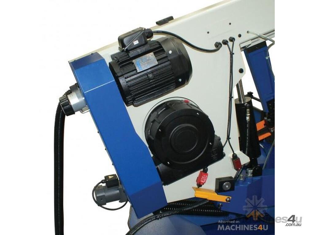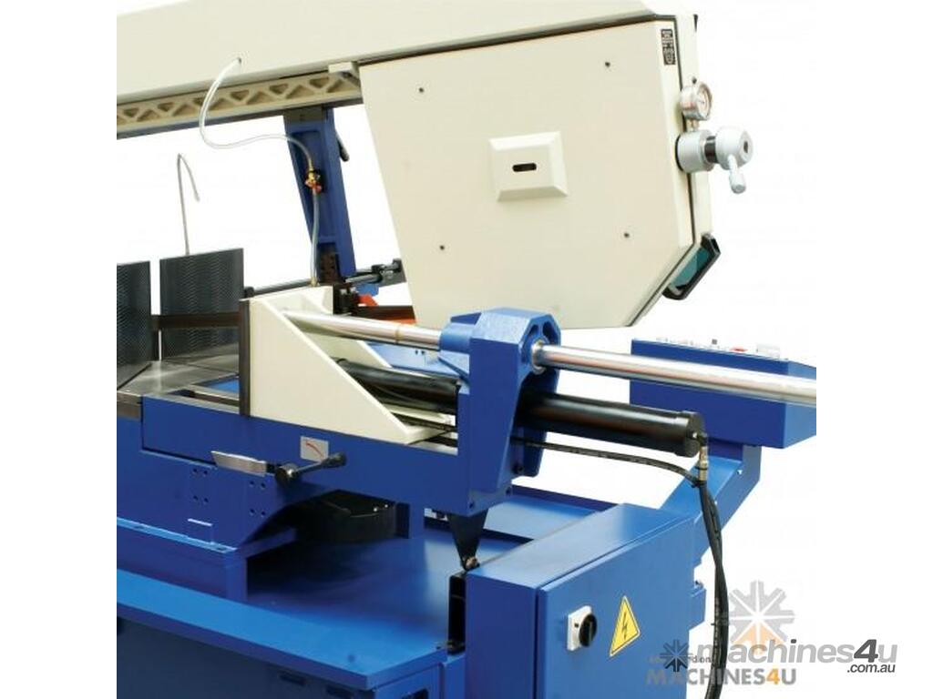 The BS-461AS is a metal cutting dual mitre swivel head, semi-automatic band saw capable of cutting a large 600x 440mm rectangle material and is a great semi-automatic band saw for cutting at 90 degrees. This saw can also cut up to 460mm round material, meaning you get more value for your investment than with any other saw on the market. Quick release lever allows the operator to change the mitre angle in seconds. This gear driven metal cutting band saw we offer has a variable speed, dual mitre cutting head, and a hydraulic controlled descent device for perfect feeds and longer blade life. The vice uses a full stroke hydraulic clamping system and after the cut is complete the blade stops, the vice opens and the head lifts to the start position for the next piece to be cut, the start position is adjustable via an adjustable micro switch at rear of machine to the desired height. The Hafco MetalMaster band saws are constructed of a heavy cast iron saw head and base and the blades are guided via a tungsten carbide insert offering rigidity and accuracy. This band saw has a powerful coolant system and a blade tensioning device that shuts down the machine if the blade breaks.