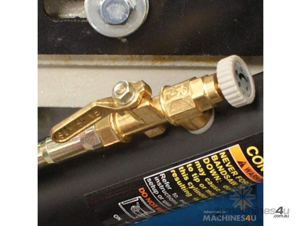 The downward cutting pressure is controlled by a fully adjustable hydraulic damper with an on/off valve and there is an automatic cut-off at the end of the cut. The vice rotates for mitre cutting and there is an adjustable material stop for consistent repeat length cutting.