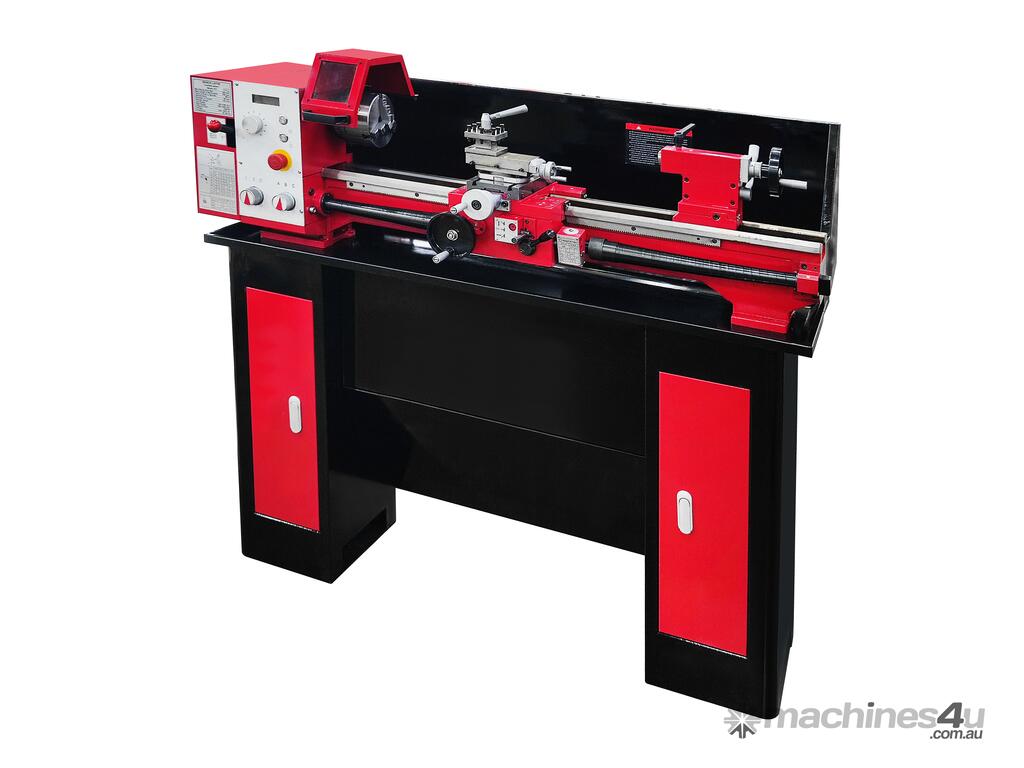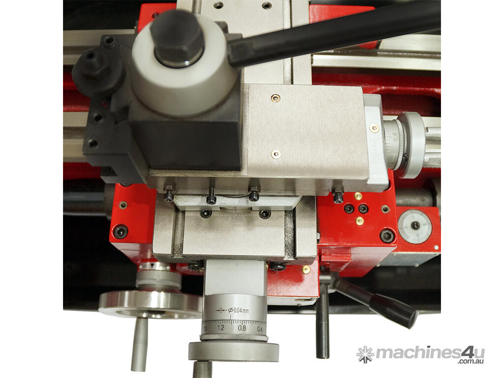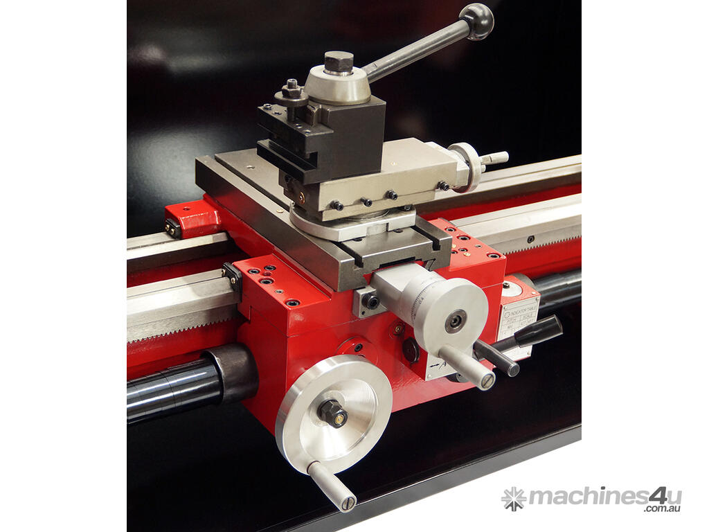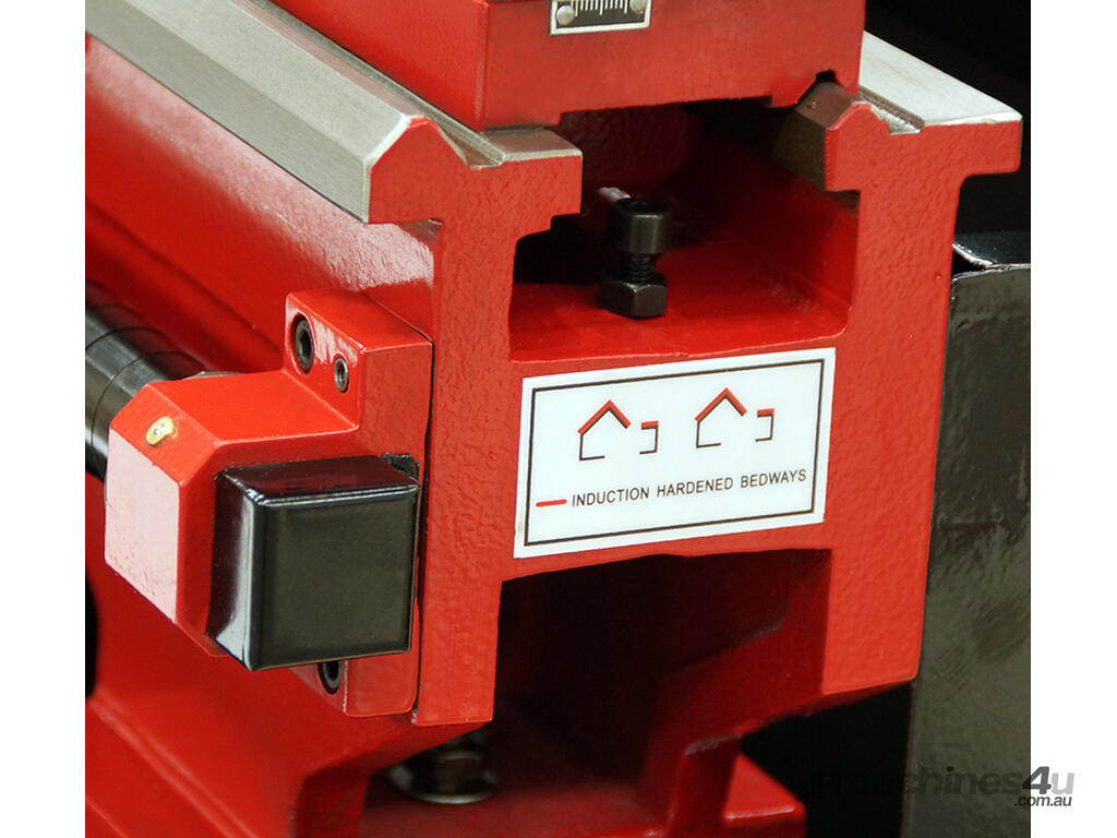 Key features include a precision-ground and induction-hardened V-bed, an oil-bathed gearbox, a quick-change tool post, a cam-lock tailstock, powered longitudinal and cross feeds, and a large 26mm spindle bore.