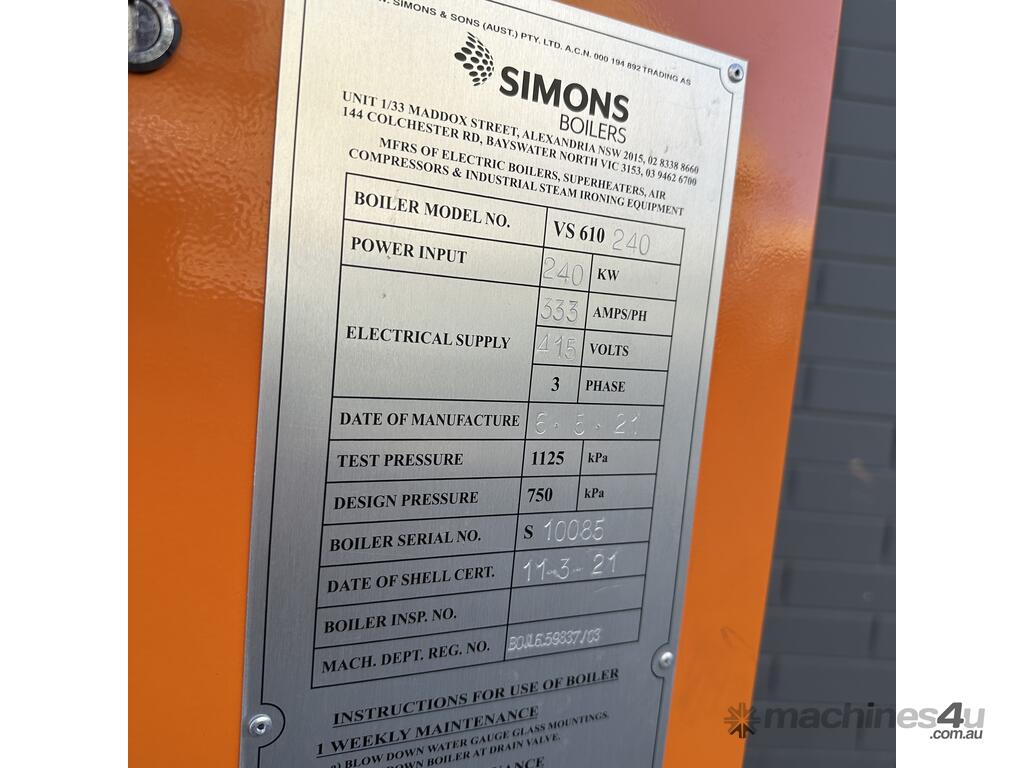SIMONS BOILERS VS610 240kW 415V 3 phase 750kPa Steam boiler 2021