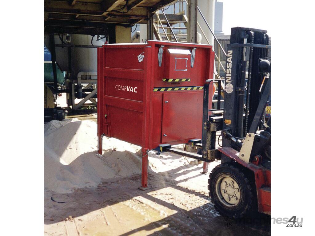 The CompVac is a semi-mobile, electrical powered vacuum unit mounted on a rigid stand equipped with retractable legs. It is designed for applications requiring collection of material into an open skip or container. It can easily be manoeuvred using a standard forklift or crane.