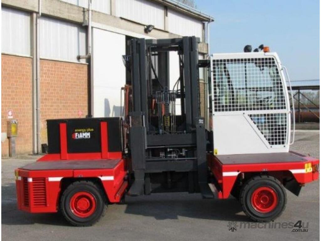 The electronic side loader model SLE40 is equipped with superelastic tires for driving and handling materials indoor and also outdoor in yards over even and uneven grounds. Thanks to the speed, strength and reduced dimensions in relation to the lifting Capacity: the SLE40 can be utilized both in outside operating areas or in inside storage warehouses.