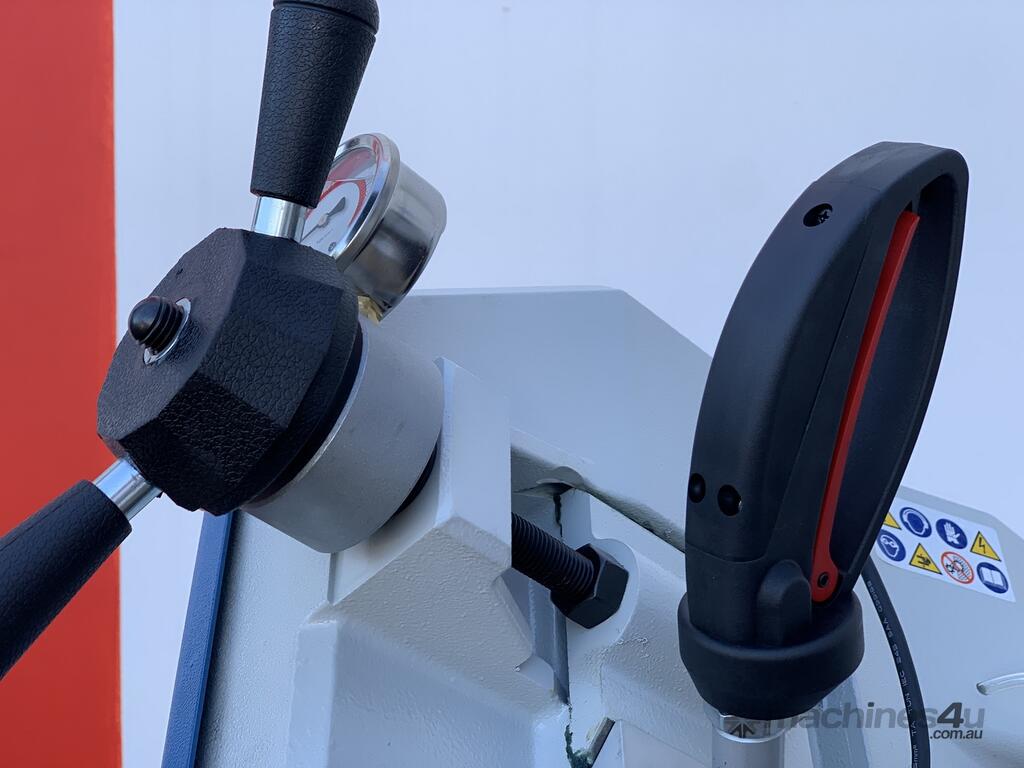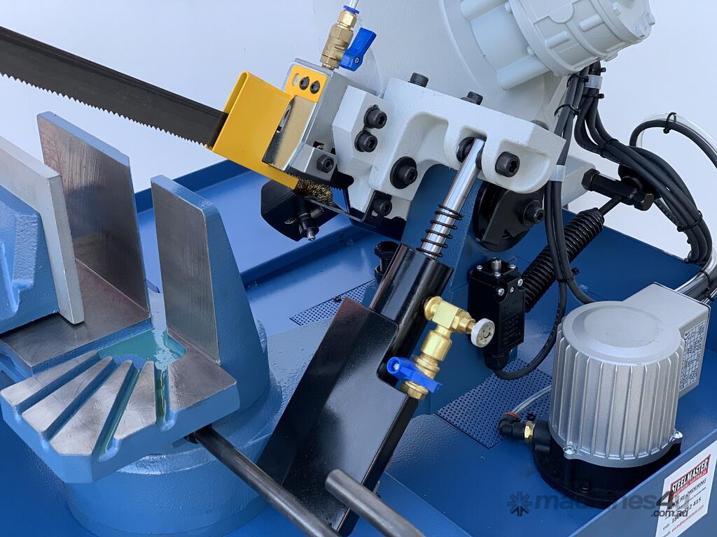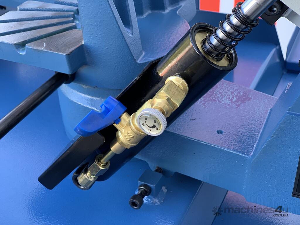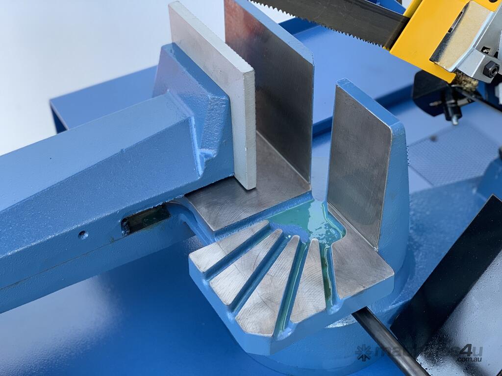 This saw is built for accuracy and production! Easy angle set-ups between 0 and 60 degrees means no wasted time between cuts. Lever controlled blade guide locks allow adjustments right up to the work piece for optimum support and the blade guides have fully adjustable ball bearings so you know you're going to get straight cuts. And when you're done, use the quick release lever and stock length stop to get on with the next cut. It's fast and simple to use! We have included other features including carbide blade guides, blade pressure gauge, hydraulic down feed, trigger switch operation, to set this aside from other base machines.