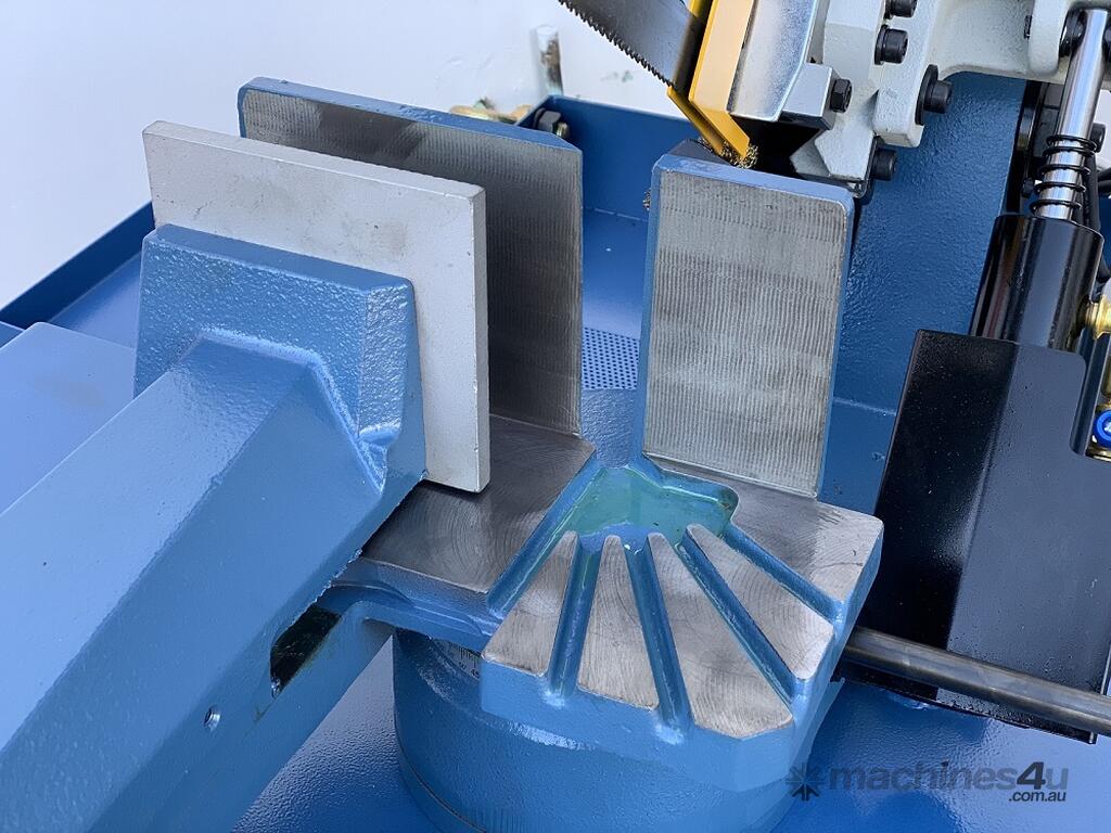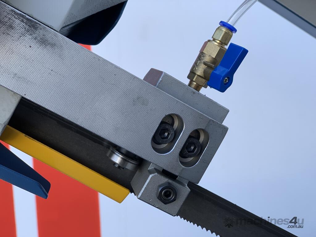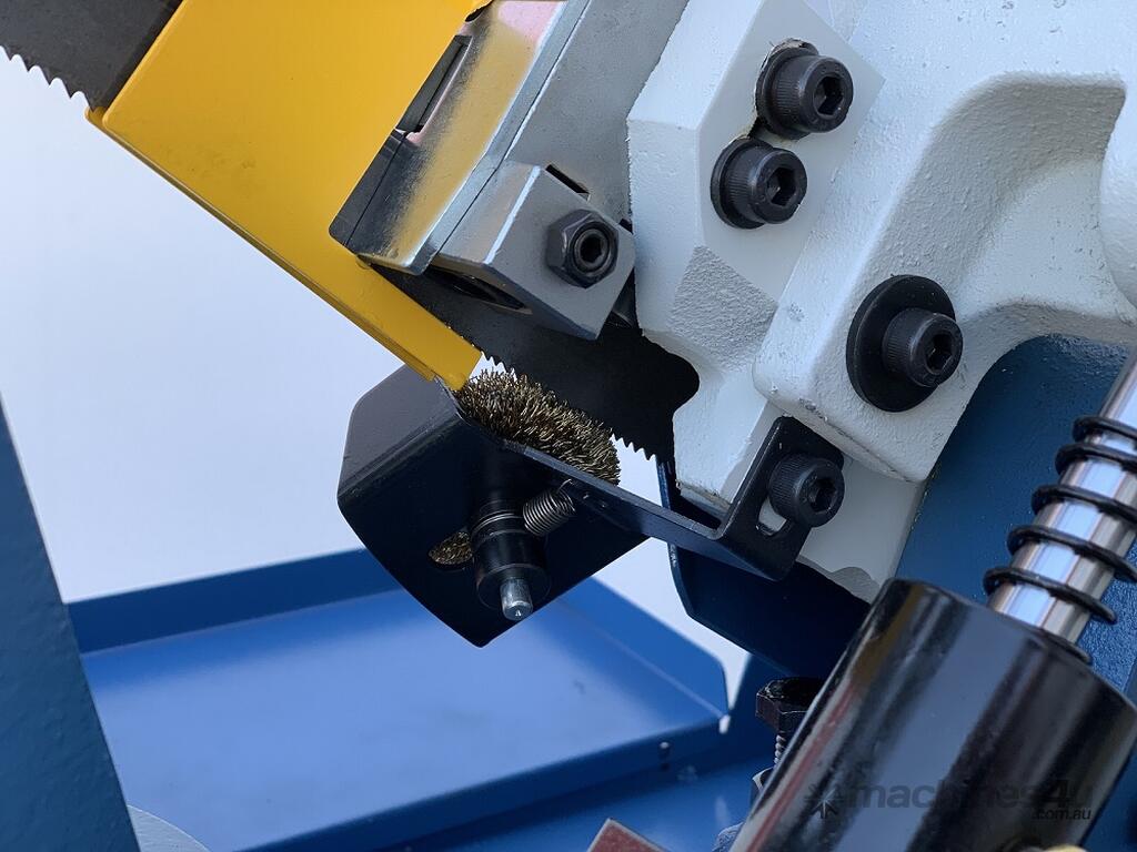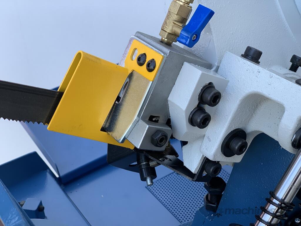 This saw is built for accuracy and production! Easy angle set-ups between 0 and 60 degrees means no wasted time between cuts. Lever controlled blade guide locks allow adjustments right up to the work piece for optimum support and the blade guides have fully adjustable ball bearings so you know you're going to get straight cuts. And when you're done, use the quick release lever and stock length stop to get on with the next cut. It's fast and simple to use! We have included other features including carbide blade guides, blade pressure gauge, hydraulic down feed, trigger switch operation, to set this aside from other base machines.