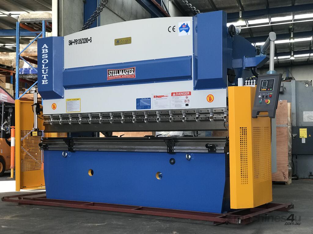 SM-PB135/3200NC-S. ABSOLUTE. Hydraulic Pressbrake. 3200mm x 135Ton. 2 Axis NC Estun E21 Control Top & Bottom Tooling, 425mm Side Throat, 2900mm Between Frames, Leadscrew Backguage with 4 Fingers.