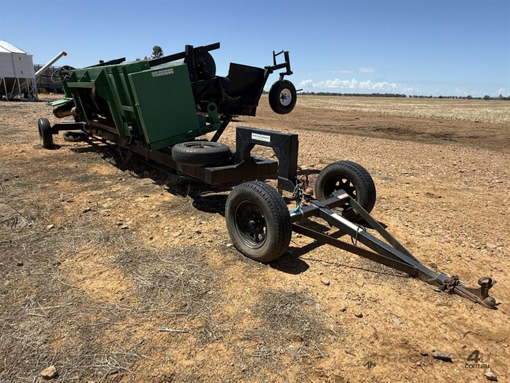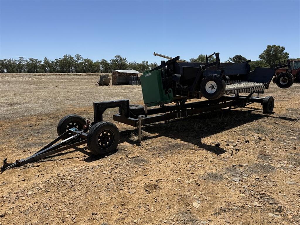 SMALE 12' PICK UP FRONT. Serial no. CF1202. Suits John Deere 9760. Hydraulic drive top feeder auger. Supplied with upgraded main auger drive kit, not fitted. Bogie trailer. Vendor states harvest ready. Located Narromine, NSW