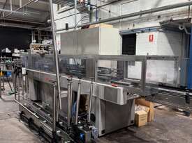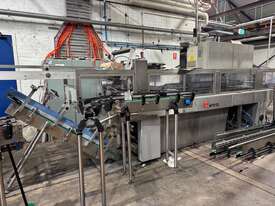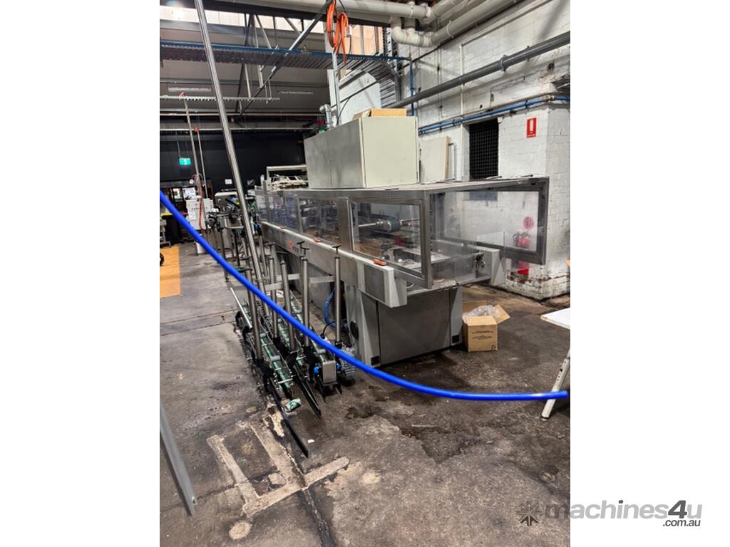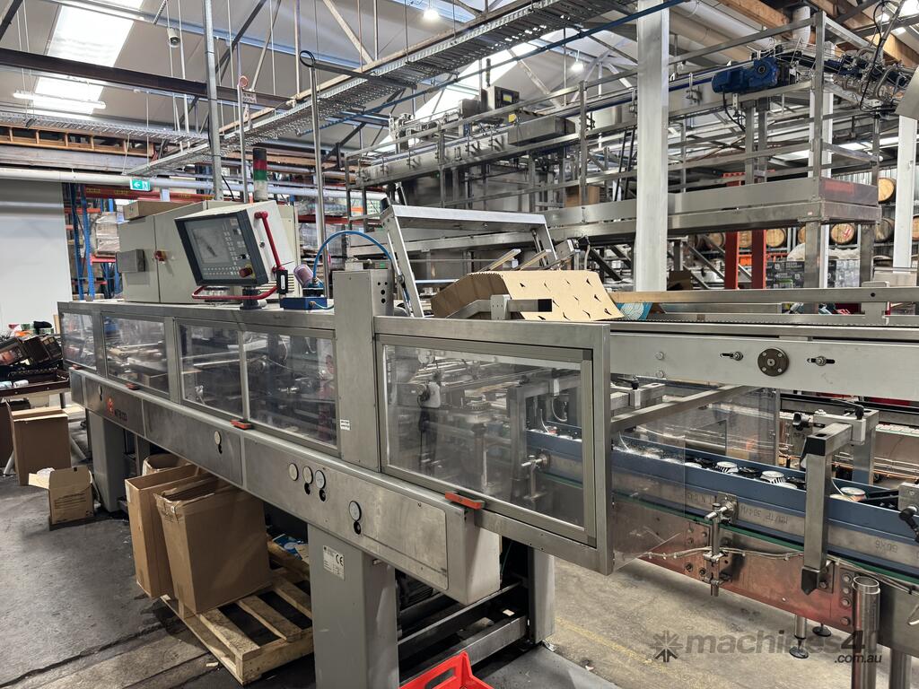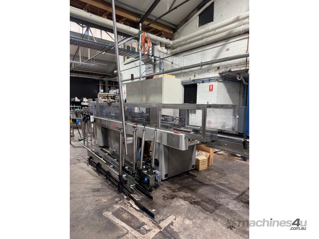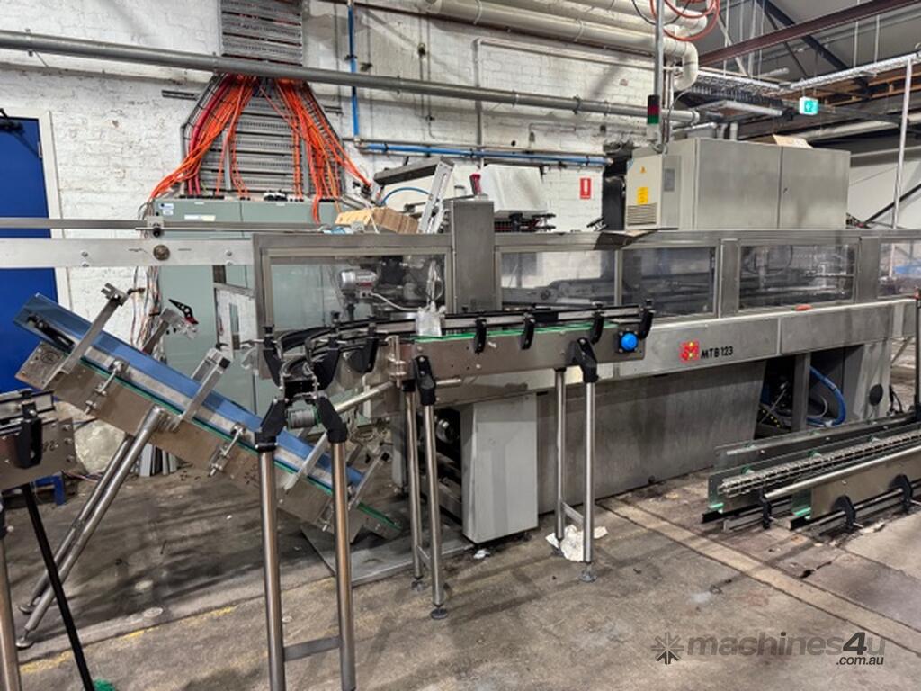 The SMI MTB 123 is an industrial, over-lapping cardboard sleeve cluster packing machine designed for high-speed container packaging, with a maximum capacity of up to 150 packs per minute. This 1999 model is used for packing glass and cans containers in 2x3 carton formats, featuring a two-track system,