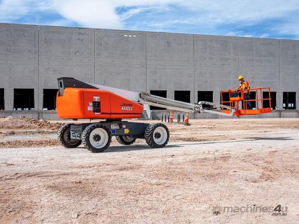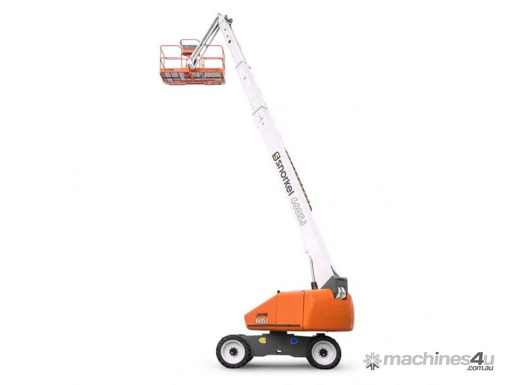The Snorkel 460SJ mid-sized telescopic boom lift was built to handle rough terrain. Fully proportional hydraulics deliver power and precision, and a jib offers flexibility on the job. The 460SJ also features powerful 4-wheel drive, minimal tailswing and 50% gradeability.