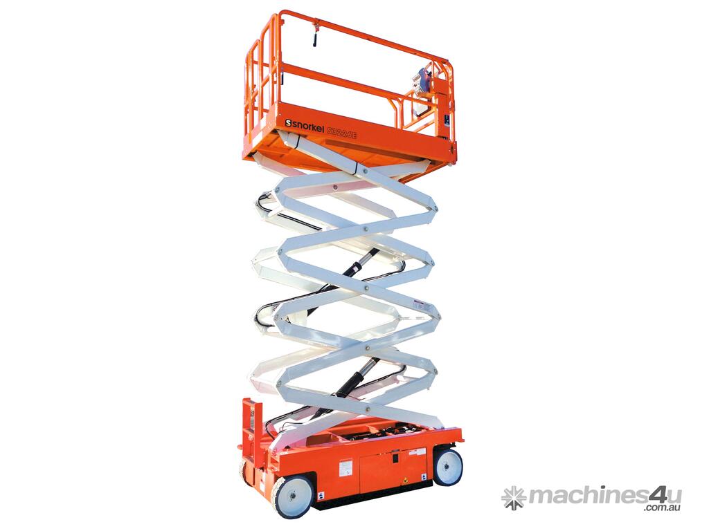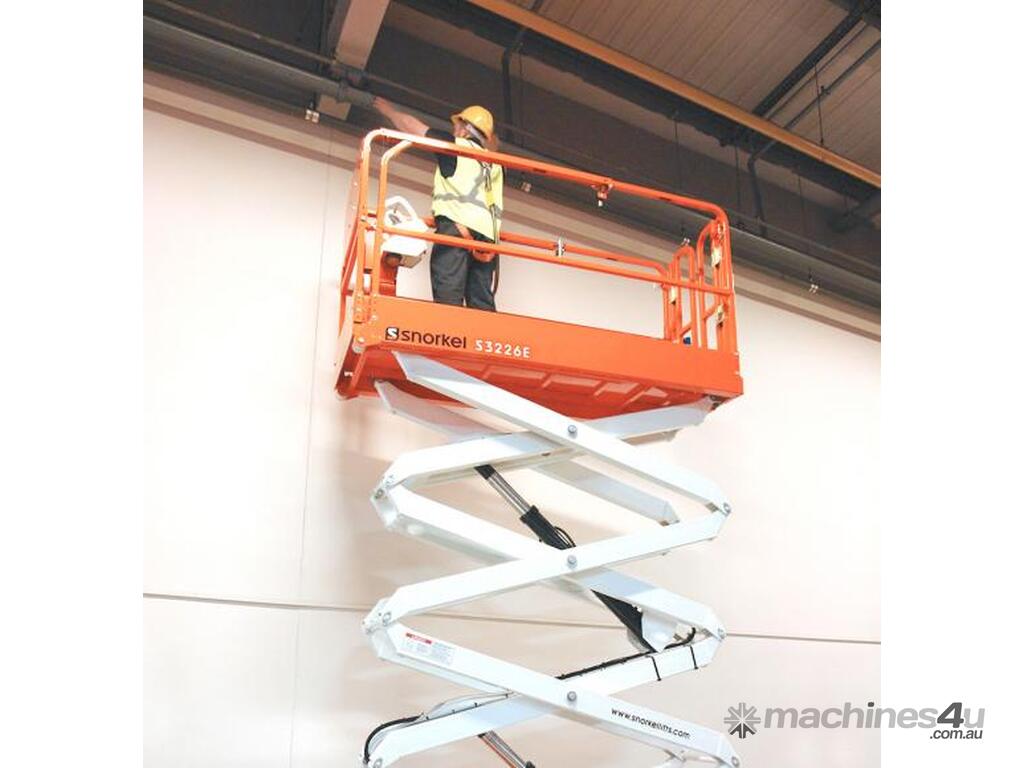 The Snorkel S3226E electric scissor lift sets a new standard within the aerial lift industry. A dual shear scissor stack and upsized pins provide rigidity, and a very stable working platform. Proportional joystick controls deliver smooth, precise control where needed most, and an integrated power outlet in the fixed upper control box eliminates trailing cables.