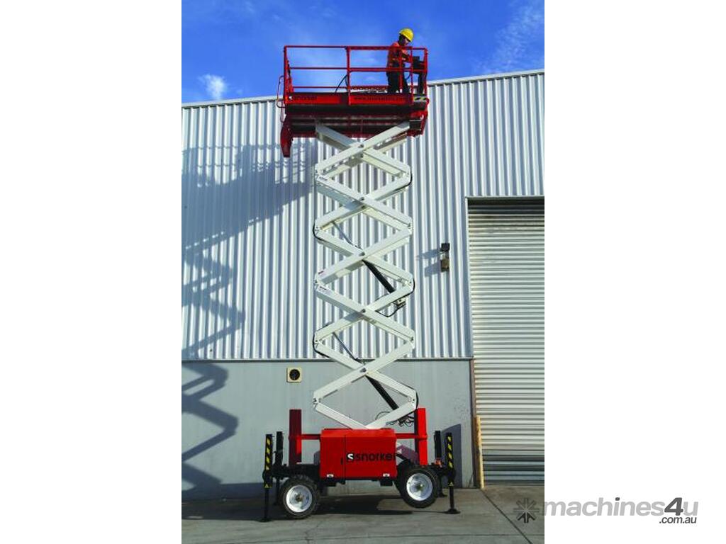 The Snorkel S3970RT rough terrain scissor lift is the largest in the Snorkel compact rough terrain scissor lift family. This diesel-powered lift features an oscillating axle and excellent ground clearance for superb off-road performance. Designed to be compact and lightweight, the versatile S3970RT can also fit in confined spaces. Auto level outriggers and a roll-out deck extension come as standard.