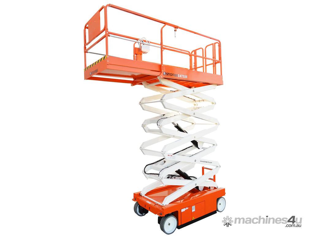 The Snorkel S4732E electric scissor lift offers the highest lift height in the line. A spacious roll-out deck extension with saloon-door style entry gates maximizes the platform working area. Deep cycle batteries ensure the lift works as long as you do, and a robust all-steel construction means it will keep on working for years to come too.