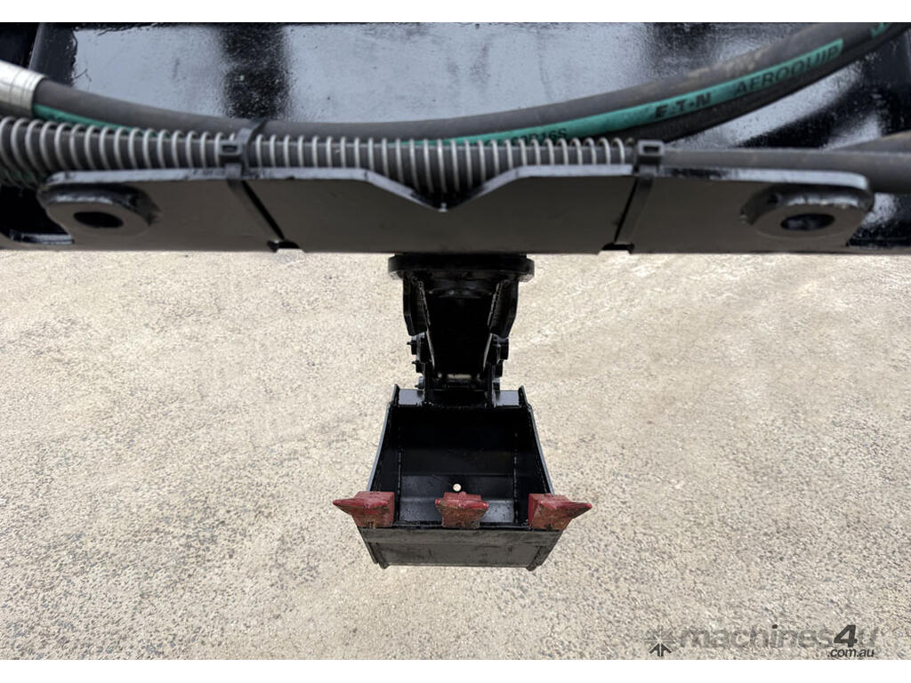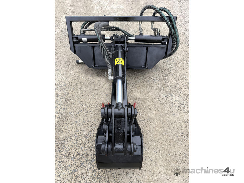 Digga pivoting front hoe for mini skid steers – excellent condition (new) – robust design – flat-face couplers (swap to poppet couplers on request) – bucket has tiger teeth for better breakage of hardened soil – bucket width 300mm.