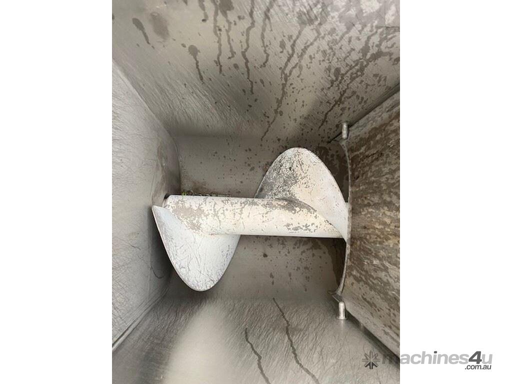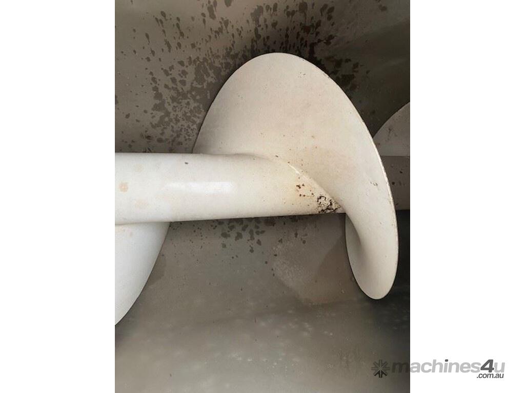 Stainless steel auger. 2 mt long x 370 mm dia. Inlet 370mm x 600mm Outlet 400mm x 400mm 0.75kw geared motor drive.