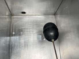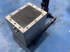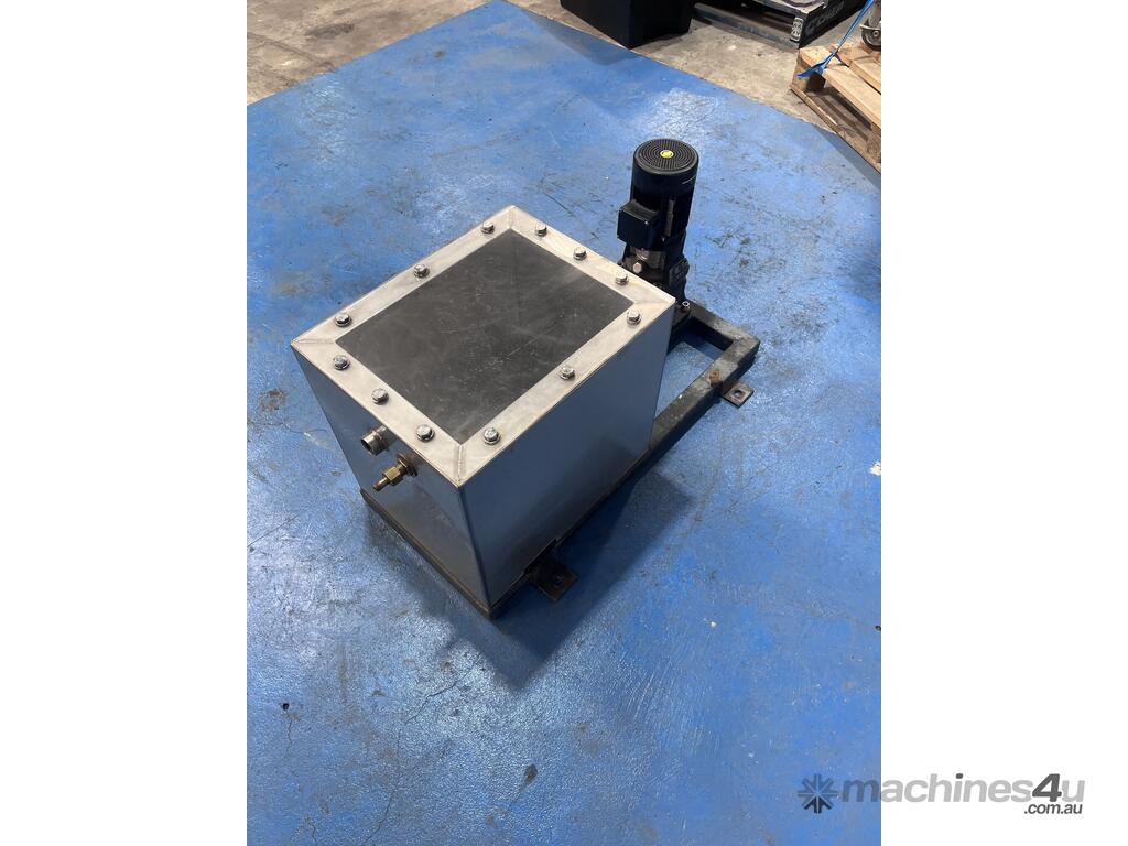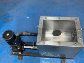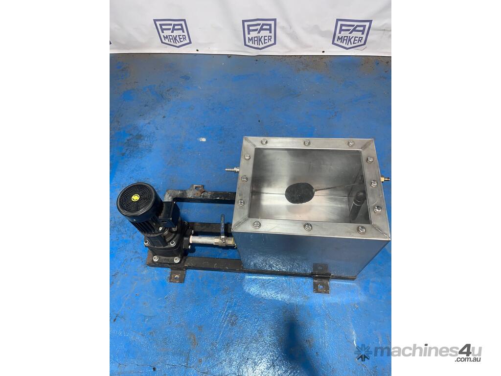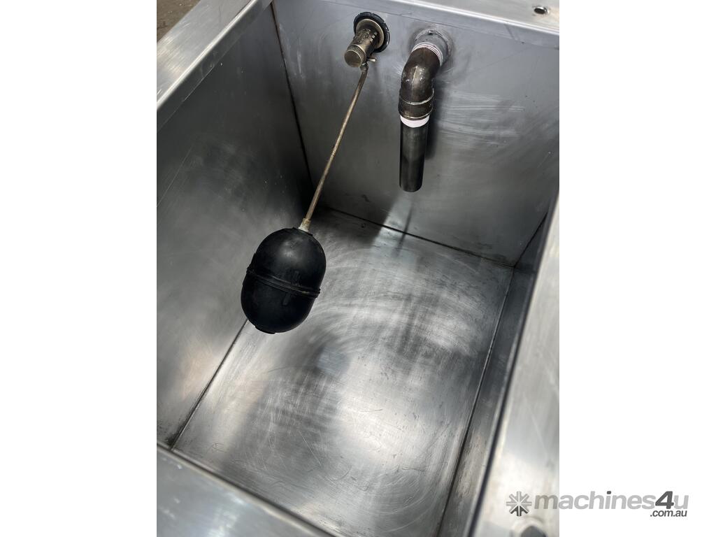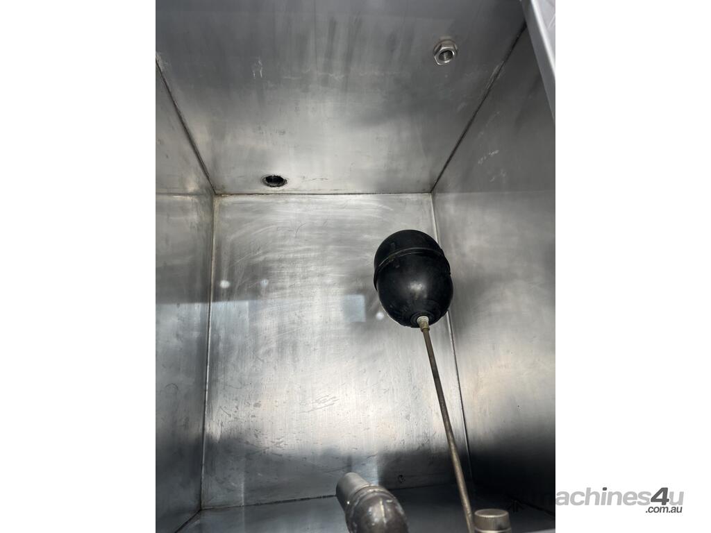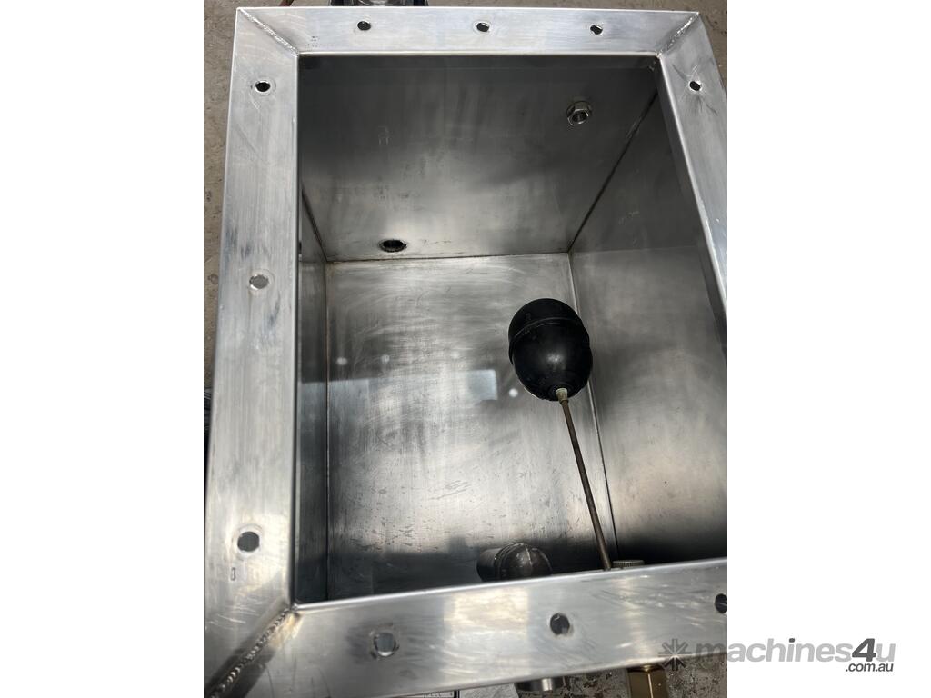 Tank has a float valve with multiple ports for filling and discharge, has a perspex cover and is mounted to a steel frame.