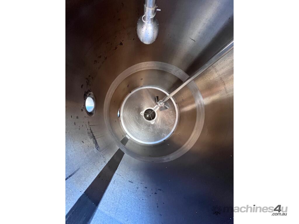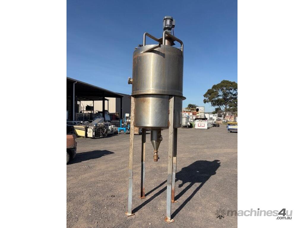 The tank is fitted with a 1.1 kW SEW geared motor driving the agitator at 120 rpm, providing effective mixing of liquids and light slurries.