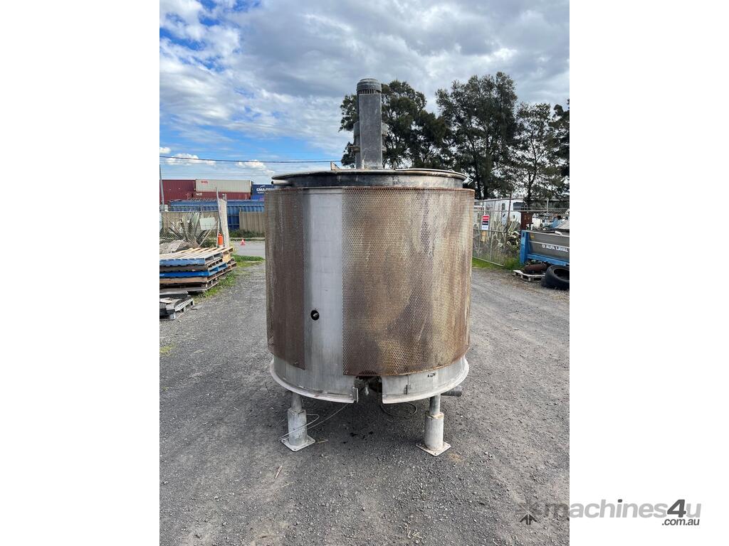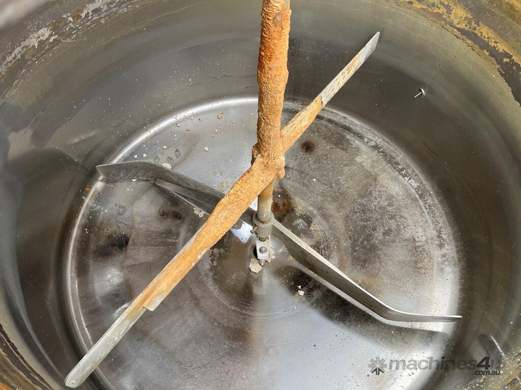 Stainless steel mixing tank with agitator and gas burner. 2300 Litres Internal tank diameter 1500mm average height of 1300mm. Overall tank height 2900mm 1.5kW 3 phase Teco geared motor. Motor RPM:1400 Gearbox: 50-1 Agitator: 28RPM 3