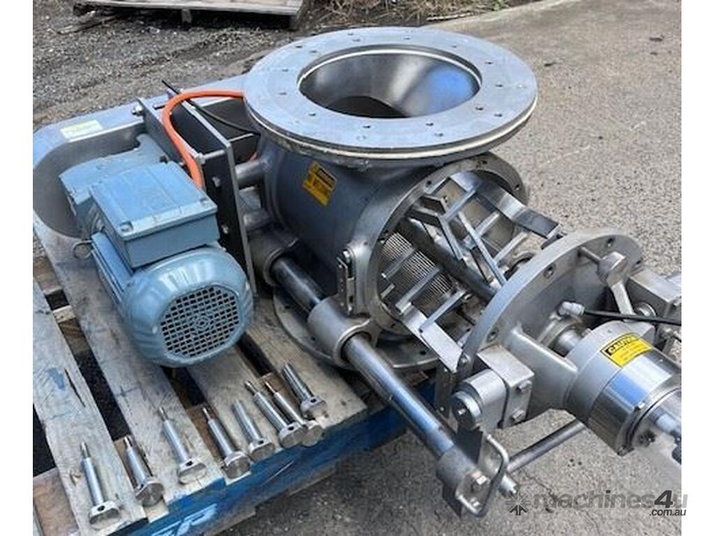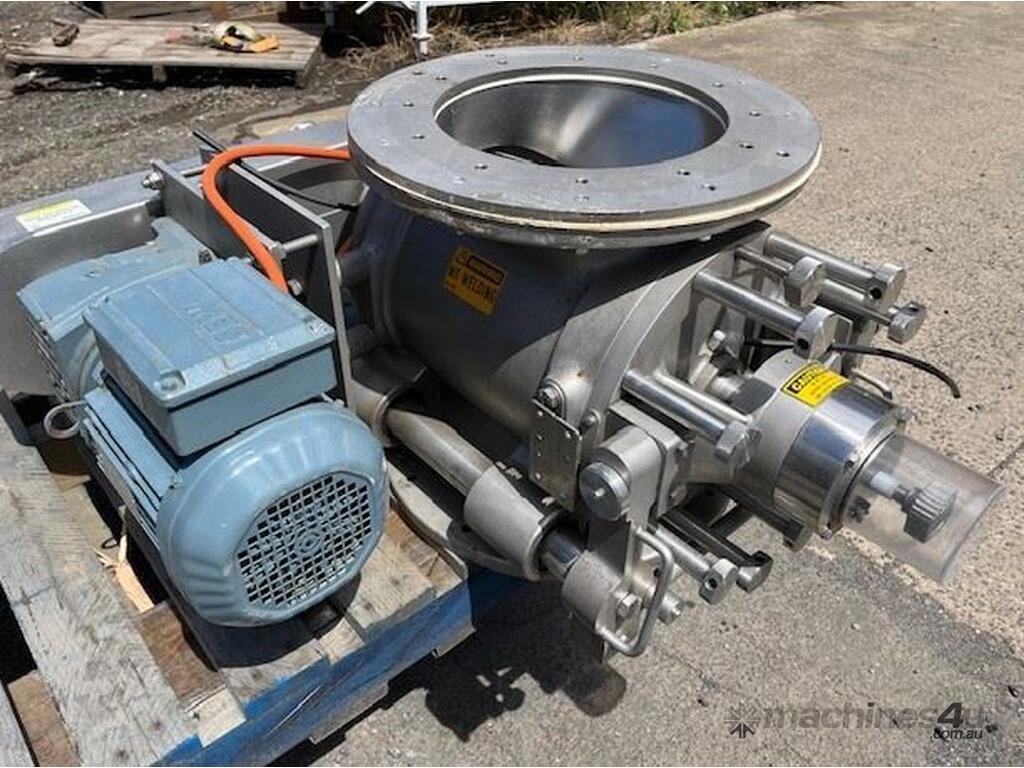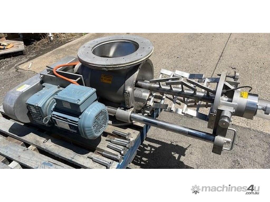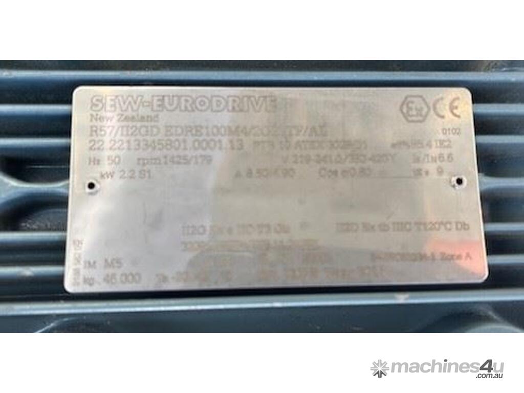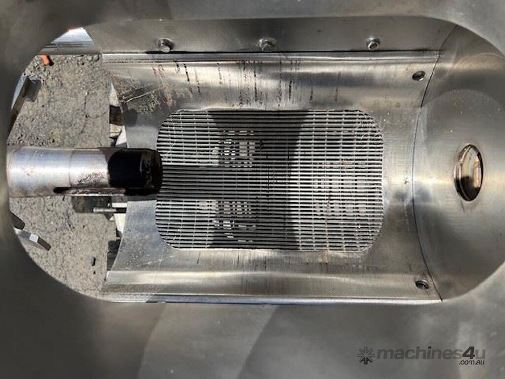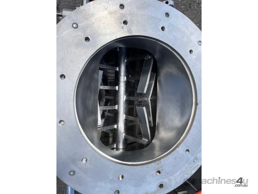 Inline stainless steel sanitary lump breaker. Designed to be mounted above or below a blender to remove lumps in powders. The paddles mix and push the powder down through the 3 mm wedgewire screen to remove any lumps in the powder. Easy clean system which the whole rotor assembly can be removed for cleaning in place. Complete with air purged seals. SEW geared drive 2.2kw 179 rpm. 300mm inlet and outlet dia. Made in NZ Year 2013 2 available. Price per unit.