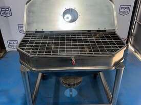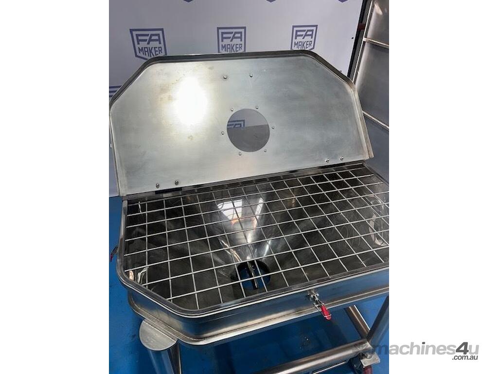 This portable SS holding bin has a hinged lid with a grate under the lid
