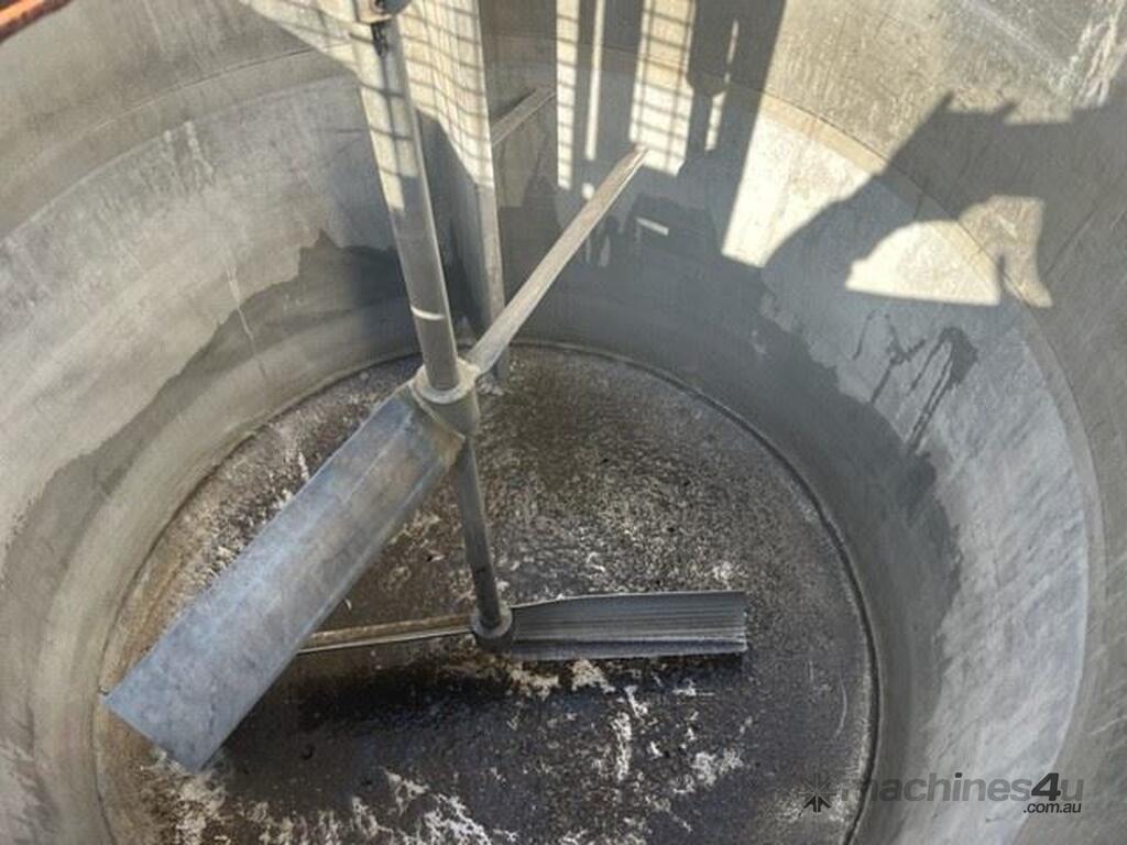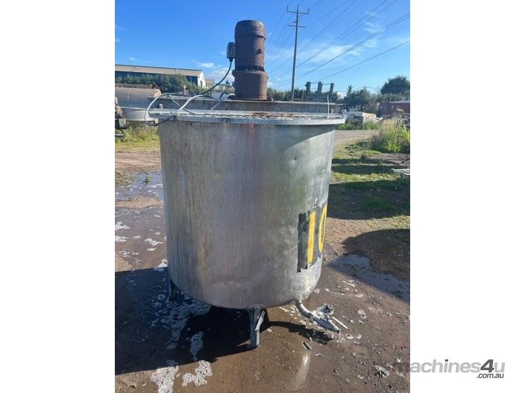 1200lt Stainless steel tank with 1.5hp 48 rpm agitator. baffles inside tank. 1 inch outlet. mesh on one lid. 1200mm dia x 1100 mm straight side.