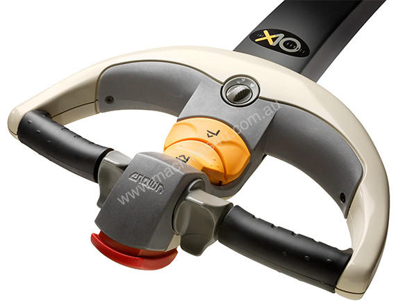 The exclusive Crown X10 Handle with its uniquely designed handgrip, thumbwheel and raise / lower buttons, simplifies operation and enhances comfort. The brake override feature enables the lift truck to turn in areas almost as small as its own footprint while the handle remains within the geometry of the truck.