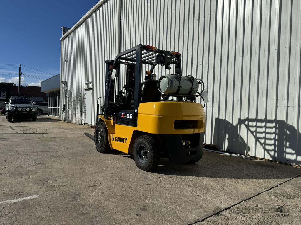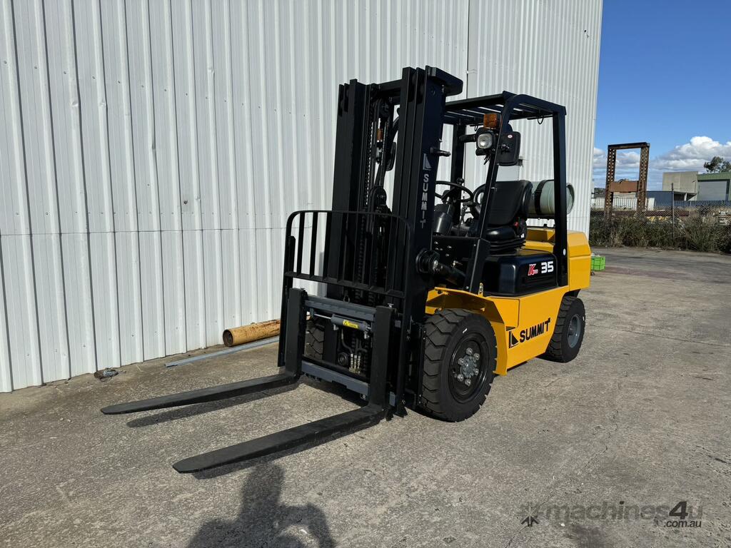 Introducing the Summit K35 3.5 Tonne Petrol & LPG Forklift, featuring a reliable Nissan Engine and offering the flexibility of dual fuel with a brand new unit and a 2-year warranty for added peace of mind.