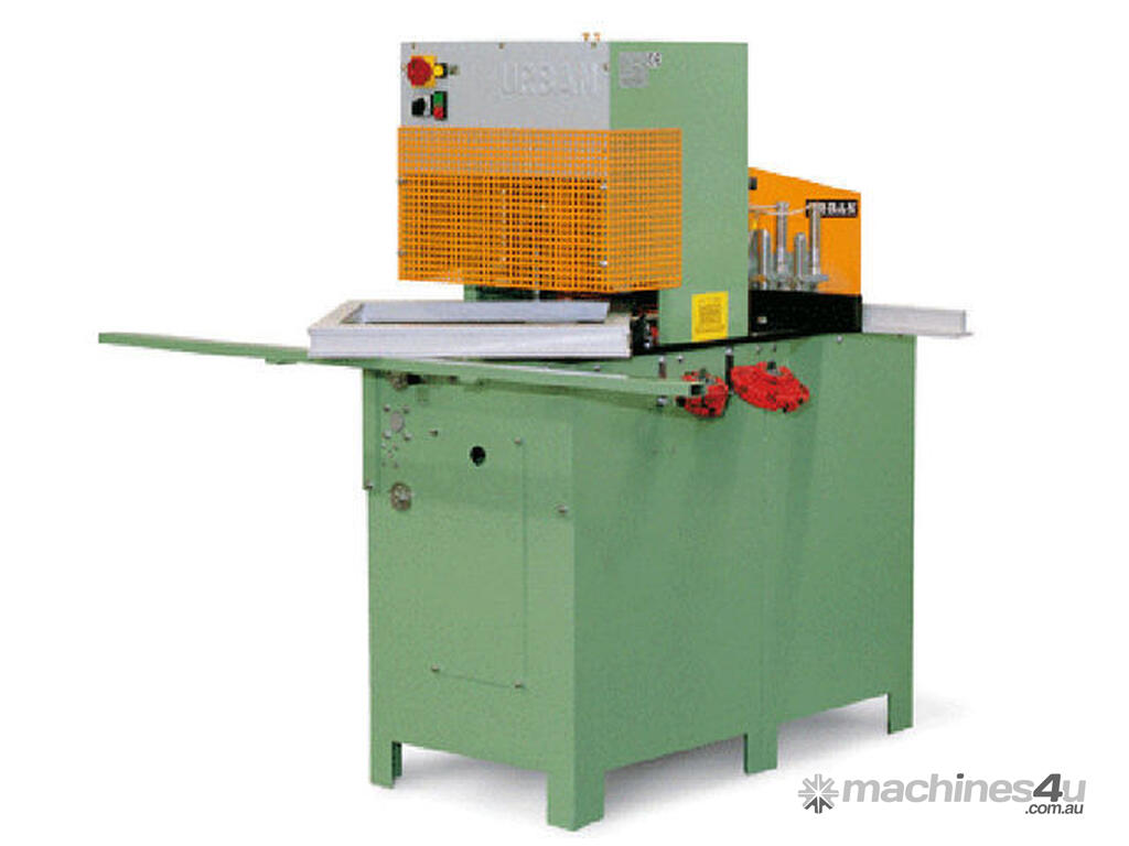 With automatic end miller for PVC window profiles or similar. With automatic turn-off of machine at power failure, electro-pneumatic control, electronically controlled   motor brake. Corner cleaning machine with automatic profile taking in, quick change  bushing 32 mm diameter, counter-clockwise, cutting shaft accommodation for a set of cutters (max. disk diameter 230 mm). Triple cutting depth stop, adjustable cutting  speed, grooving knife top and bottom. Automatic end miller - rotation  clockwise/counter- clockwise reversible, stepless 60°-90°-22.5°, pneumatic    clamping device, adjustable cutting speed, aluminium sheet protection.