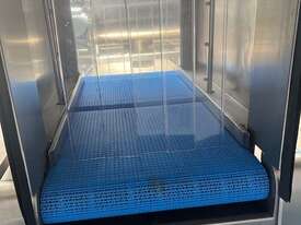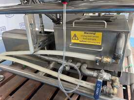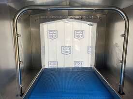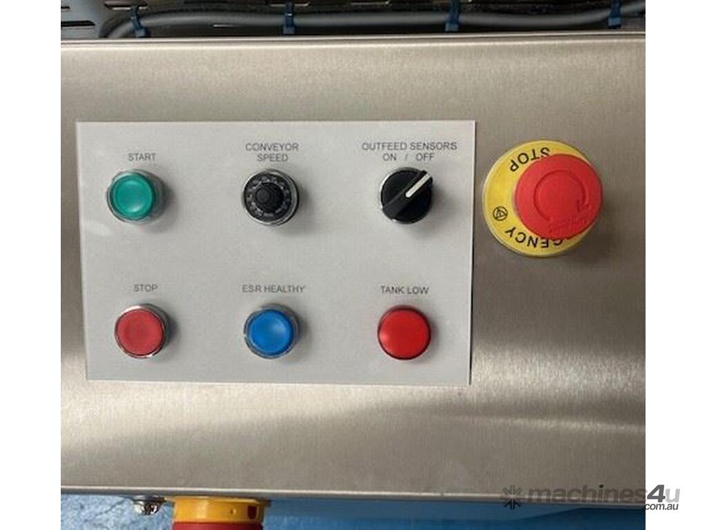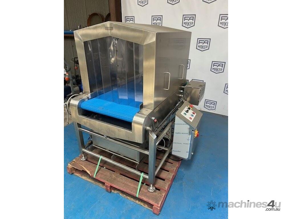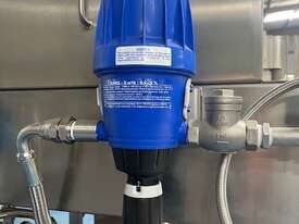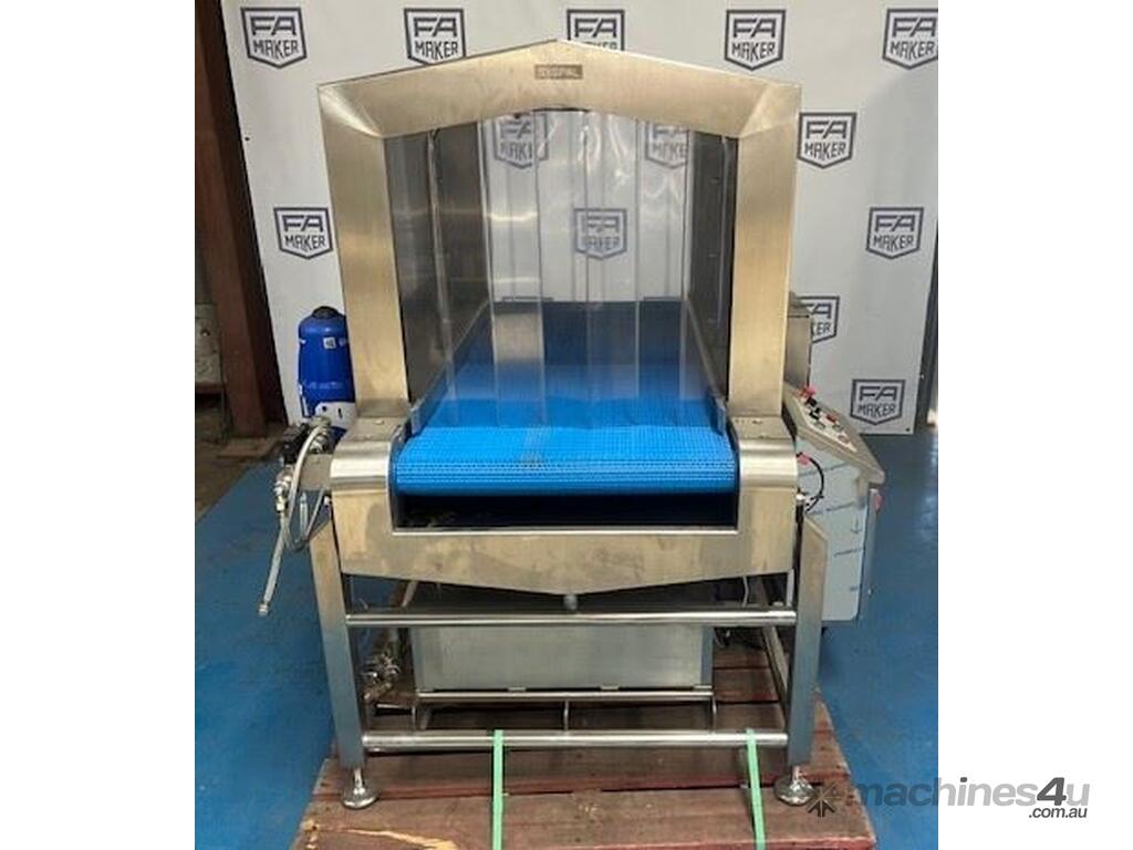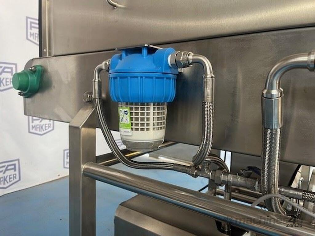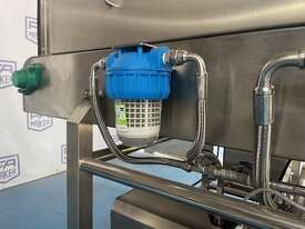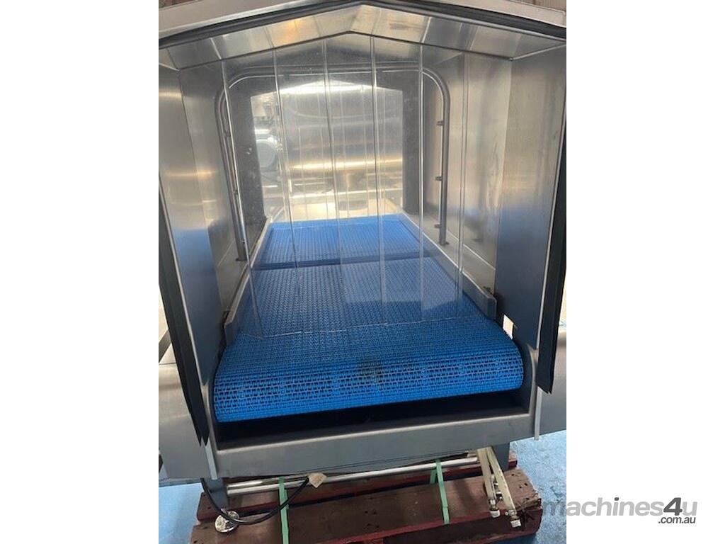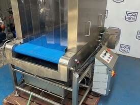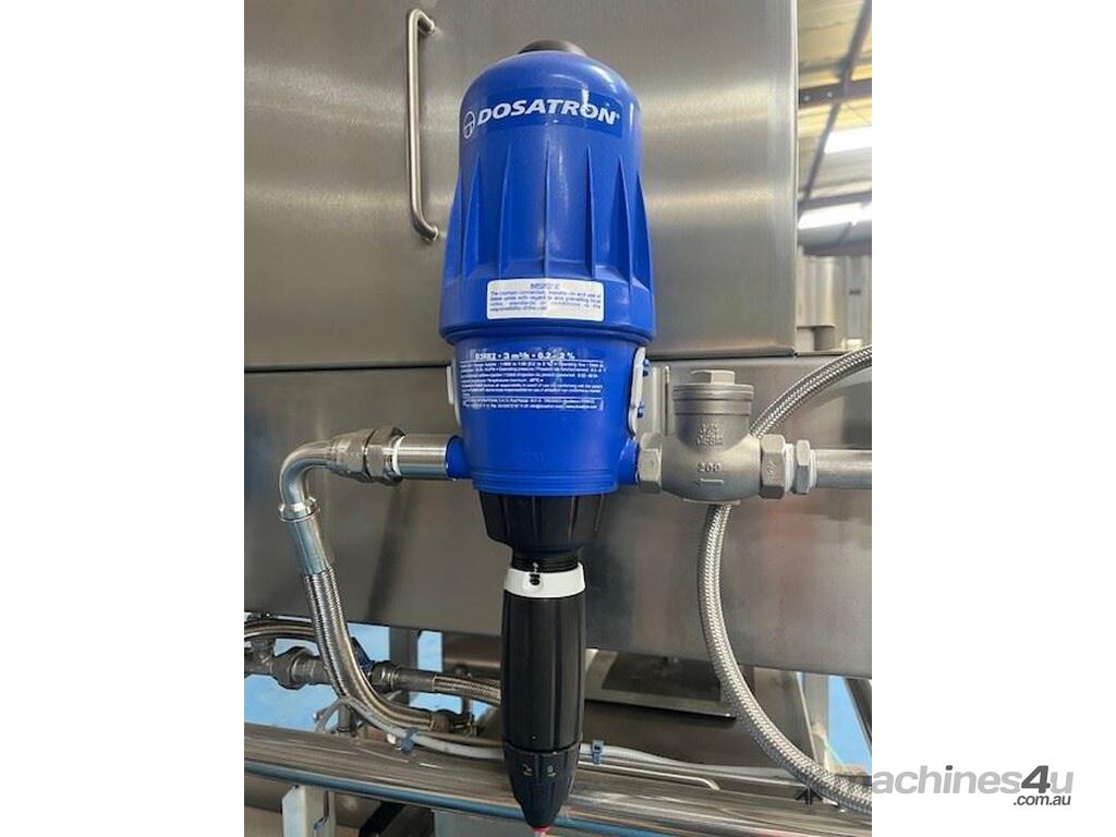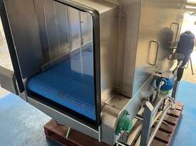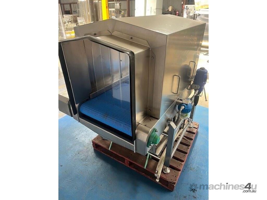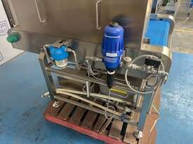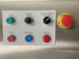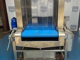 Sanitising conveyor for taking product from low-care to high-care 1.3m long x 600mm wide belt. Auto fill and full recirculation system Lift off stainless steel hood for easy cleaning Dosatron chemical dosing unit with adjustable dose rate of 0.2% - 2.0% All legs complete with adjustable feet and bolt down facility Infeed product sensor for operation start Variable conveyor drive -10 mtrs/min 50Hz Side mounted IP67 rated control panel Removable sanitising solution tank with recirculation mesh filter, drain valve and overflow facility Provides the facility to convey ingredients, utensils