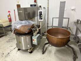 Savage S92 Firemixer is a professional gas-fired cooker-mixer praised for its one-person operation, precision temperature control, and durable construction, making it ideal for small to mid-sized confectionery businesses. It features a hydraulic lift to raise and lower the agitator, spring-loaded scrapers for efficient heat distribution, and a visible flame for manual gas throttling. Available models offer different agitator styles (single or double-action) to suit various recipes, from soft candies to stiff products like fudge.