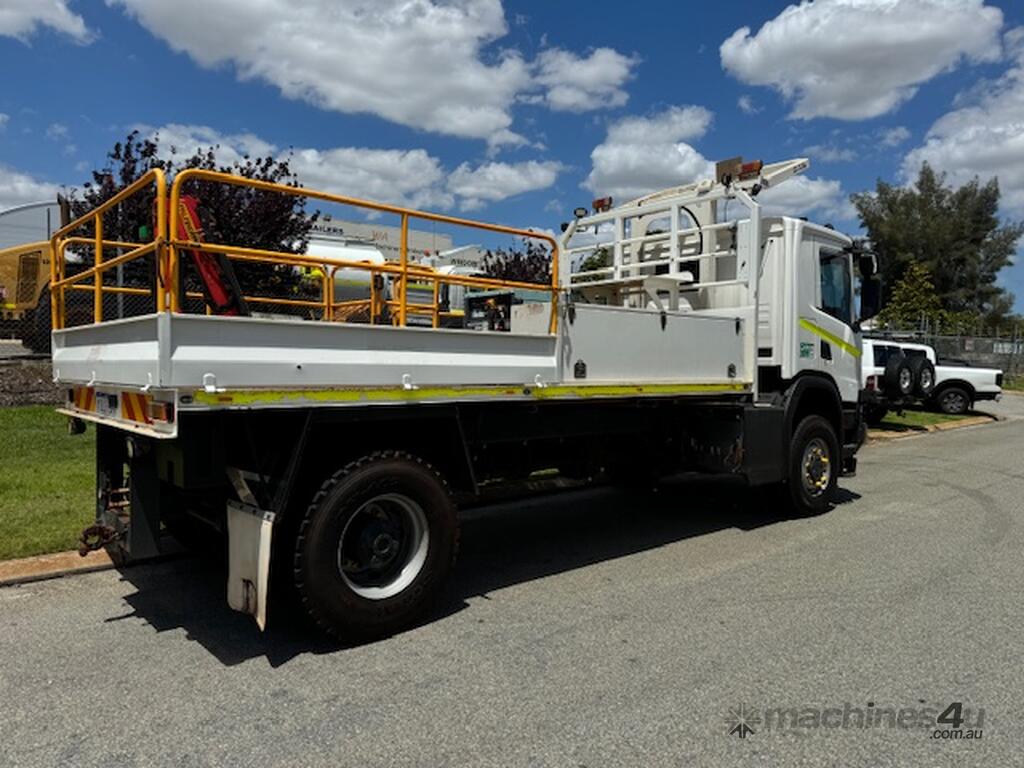 Scania P280 Auto 4x4 km Crane Compressor and ROPS 1ILI249 SN1696. ROPS. Tow bar with air. 80CFM compressor. 1500kg Palfinger crane with remote.
