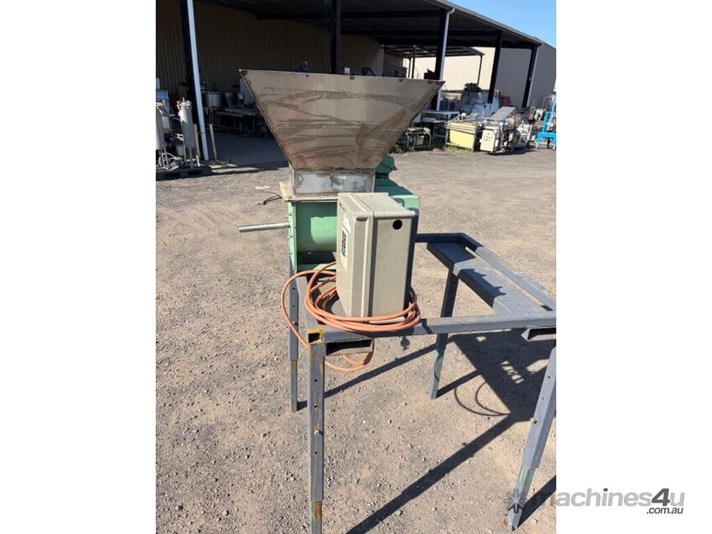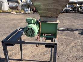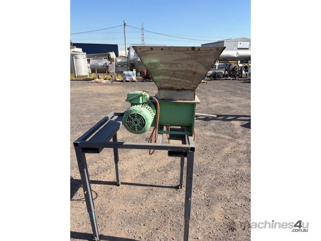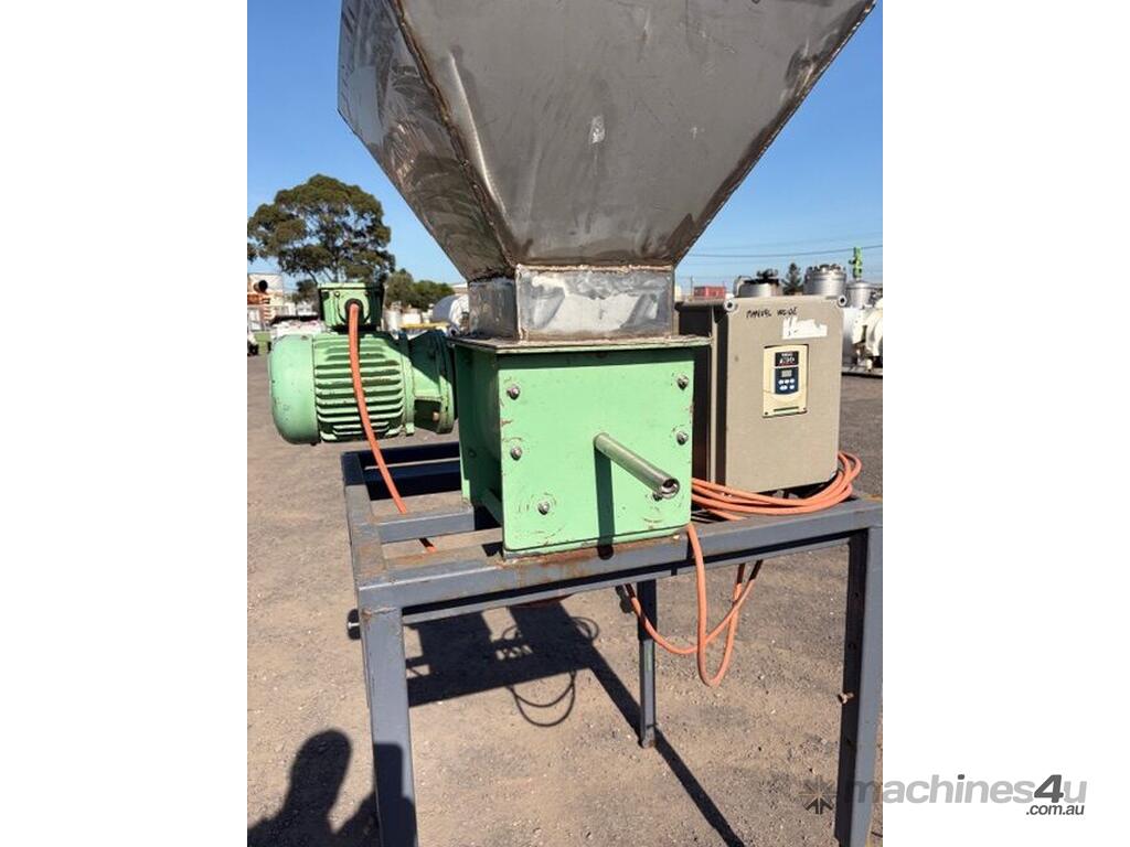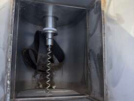 A practical and ready-to-work volumetric screw/auger feeder powered by a 1,1kw, 415V TECO motor and equipped with a variable frequency drive (VFD) control panel for precise feed rate adjustment. The stainless steel hopper features an internal agitator and helical auger screw to deliver consistent, metered flow of dry powders or granular materials. Mounted on a sturdy fabricated steel stand, this unit is well-suited to food processing, chemical, plastics, or agricultural applications. Offered as-is in fair working condition — cosmetically worn but mechanically sound.