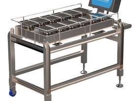 Ideal for handling hard to pack and delicate products with one operator grading and loading the scale pans, with a second operator removing and packing as instructed by the machine’s visual light indicators. Typical throughput is 18 packs per minute, with 2 operators with a typical a 30% increase in speed using this process.