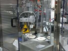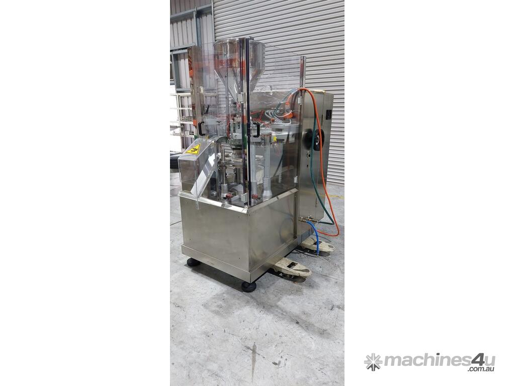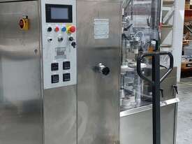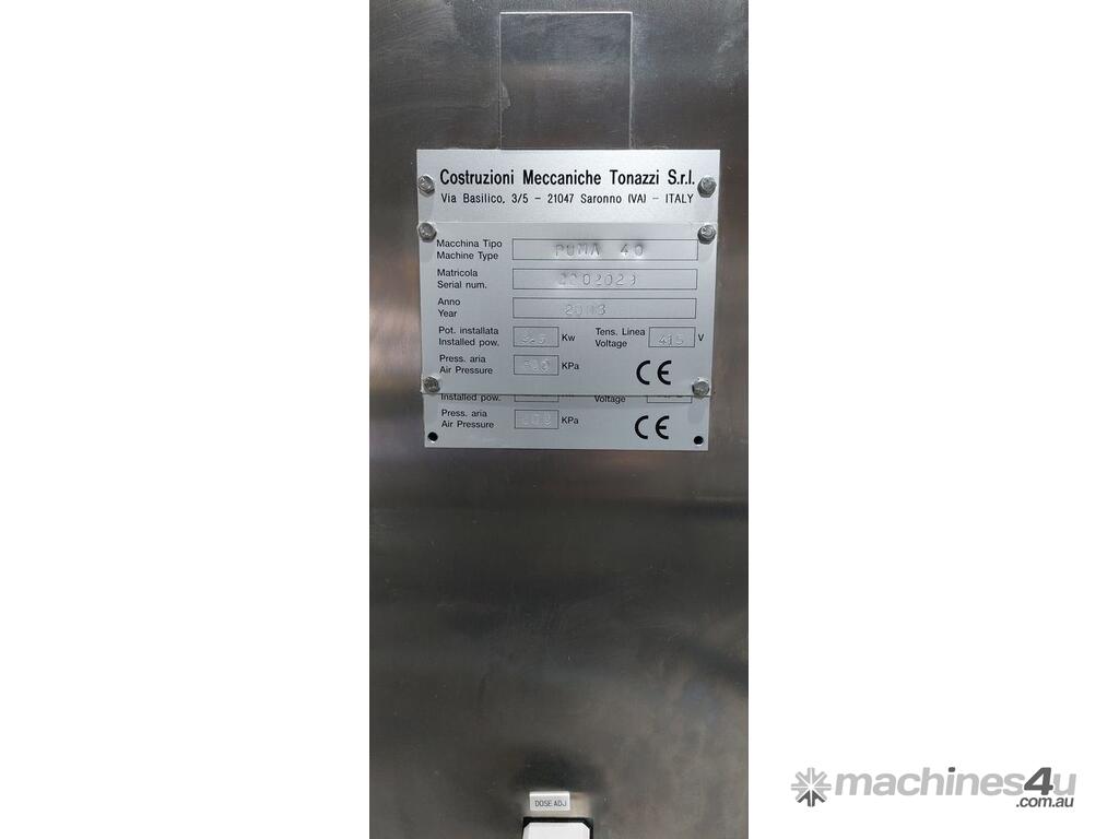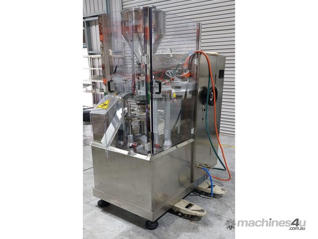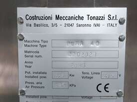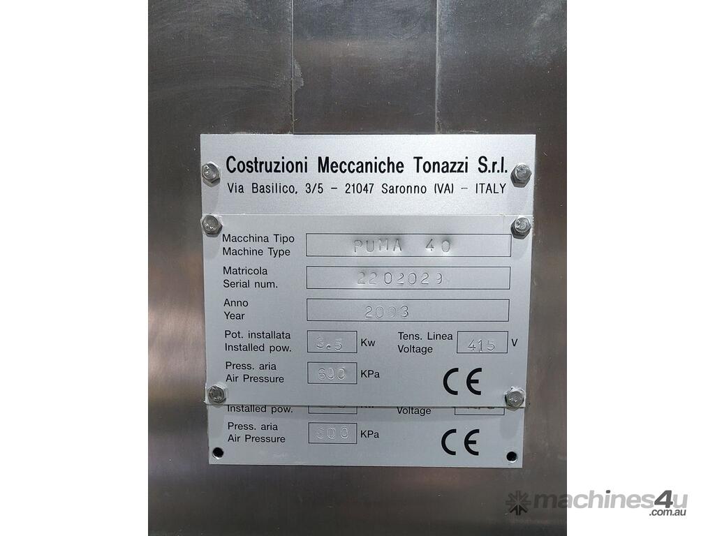Semi- Automatic Tube Filler, "Tonazzi" Model Puma 40, 3 phase 3.5kw, built year 2003, Stainless Steel Frame, Currently set-up for 100g tubes: tube length before cutting 162 mm, tube diameter 38mm, tapered cap diameter 36-38 mm