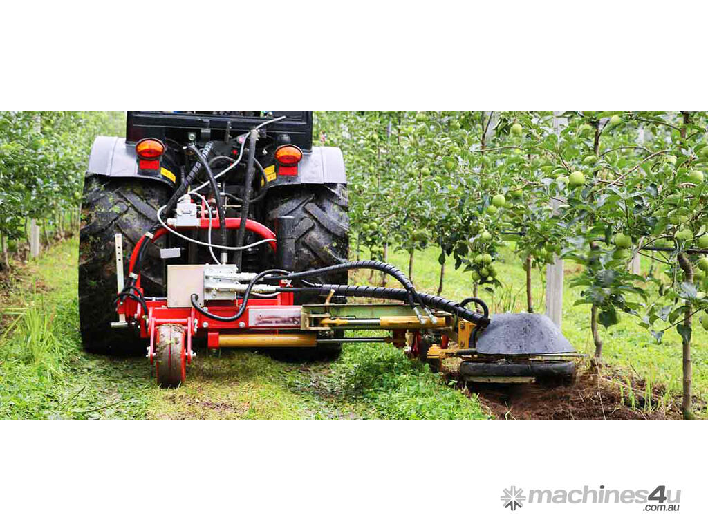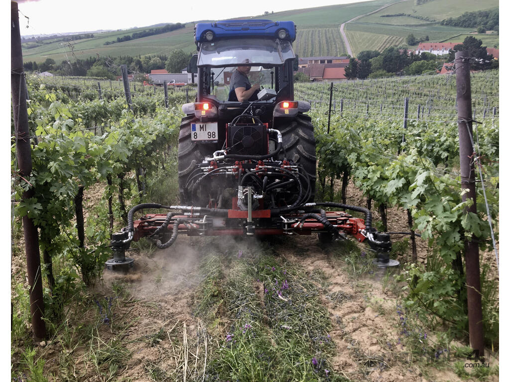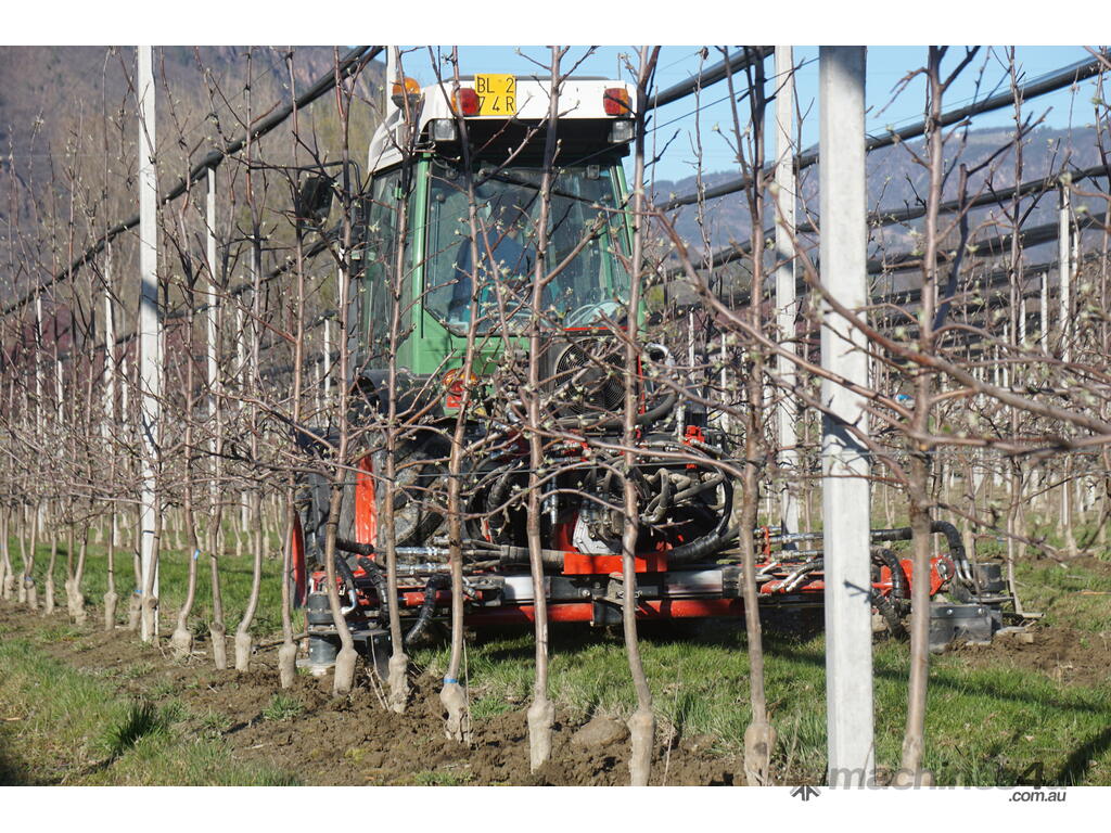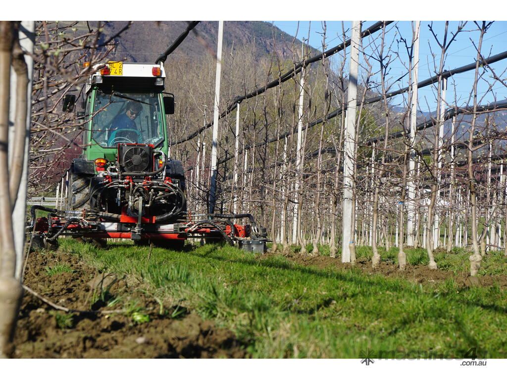 The carrier can be equipped with easy changeable accessory modules for under canopy maintenance. The hydraulic side shift allows a telescopic adjustment of the working outreach between the growing rows.