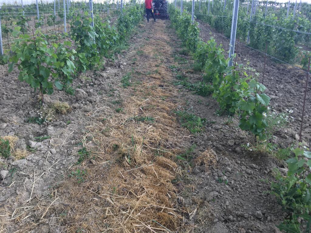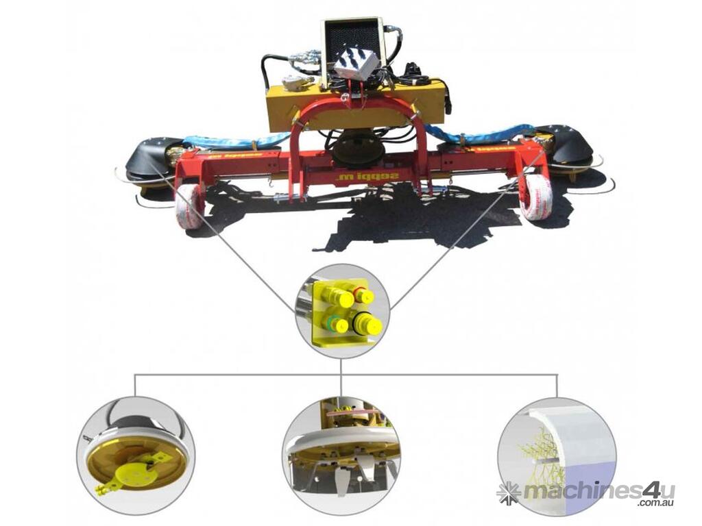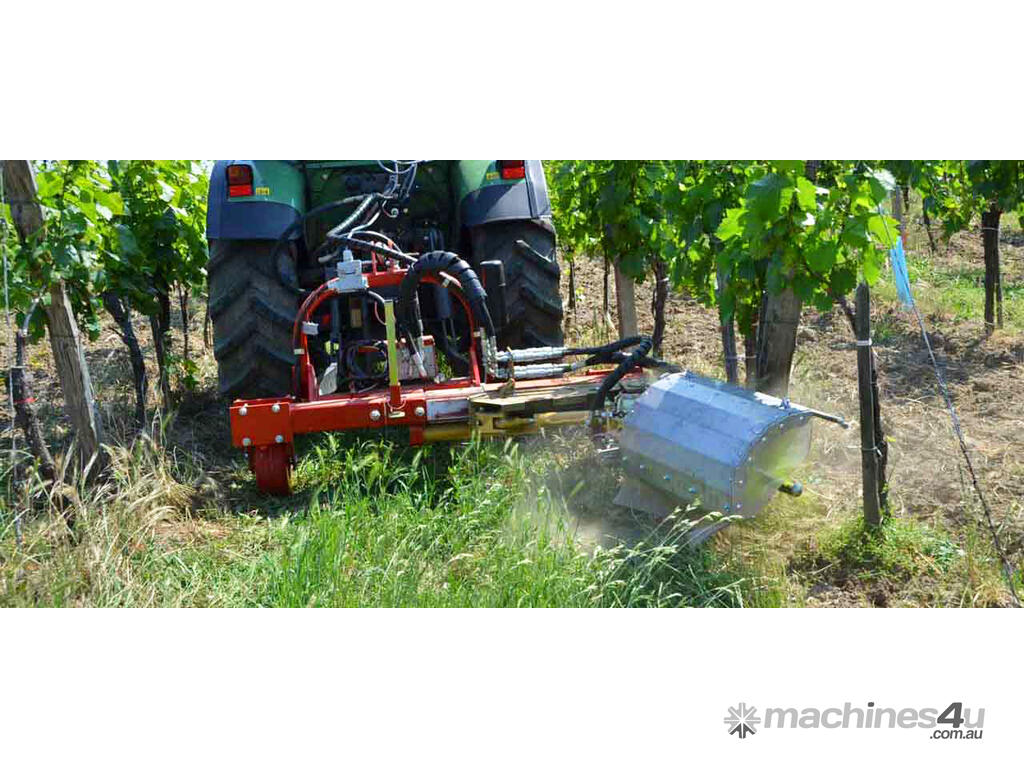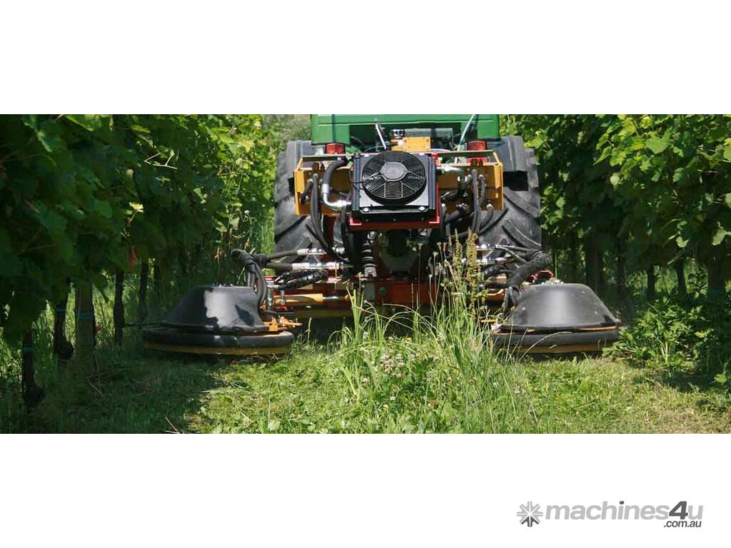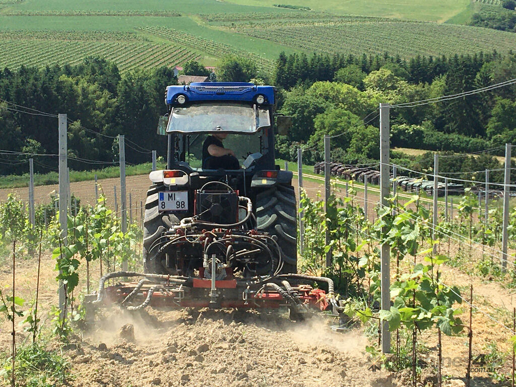 The carrier can be equipped with easy changeable accessory modules for under canopy maintenance. The hydraulic side shift allows a telescopic adjustment of the working outreach between the growing rows.